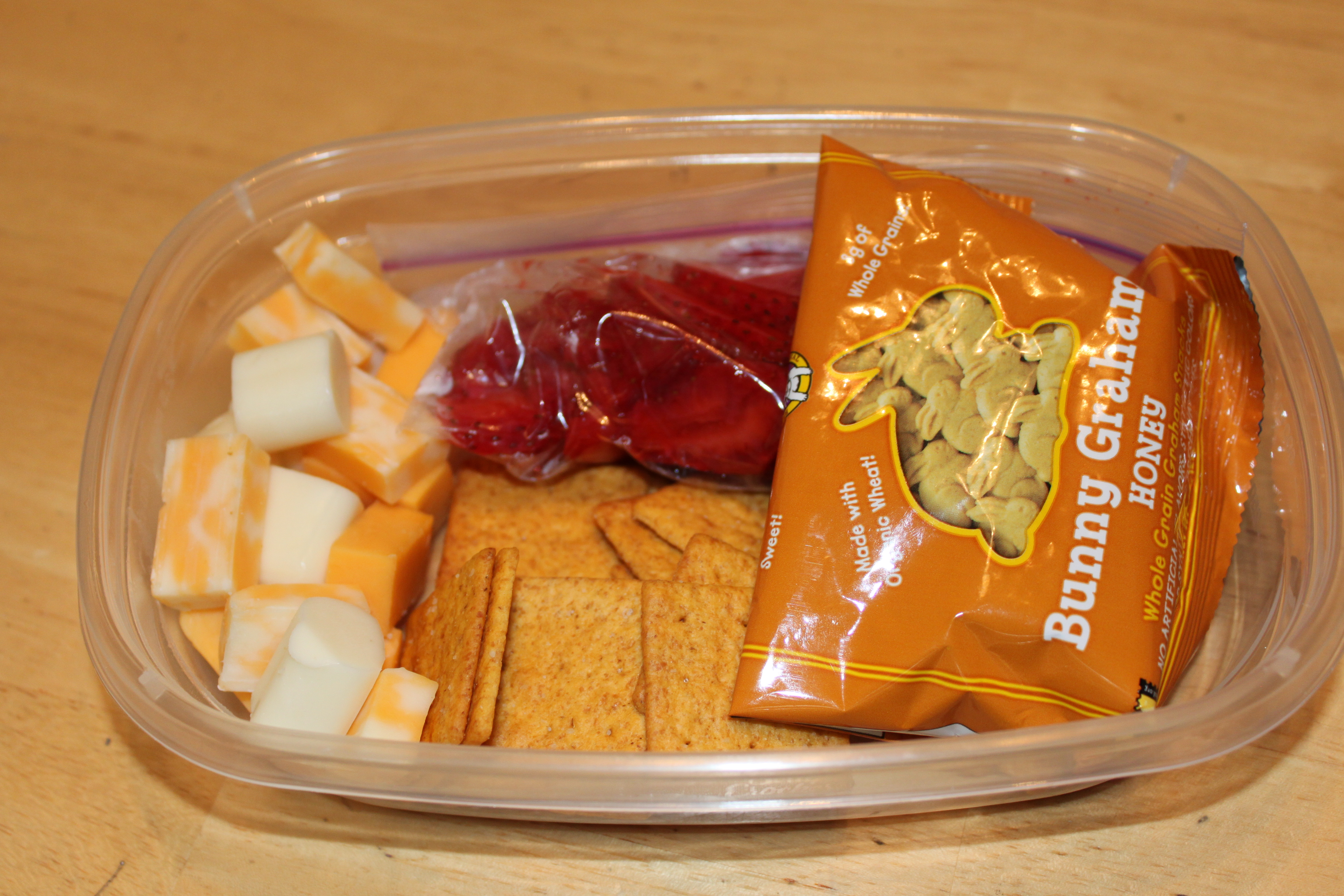 Cheese cubes, Wheat Thins, sliced strawberries, honey bunny grahams