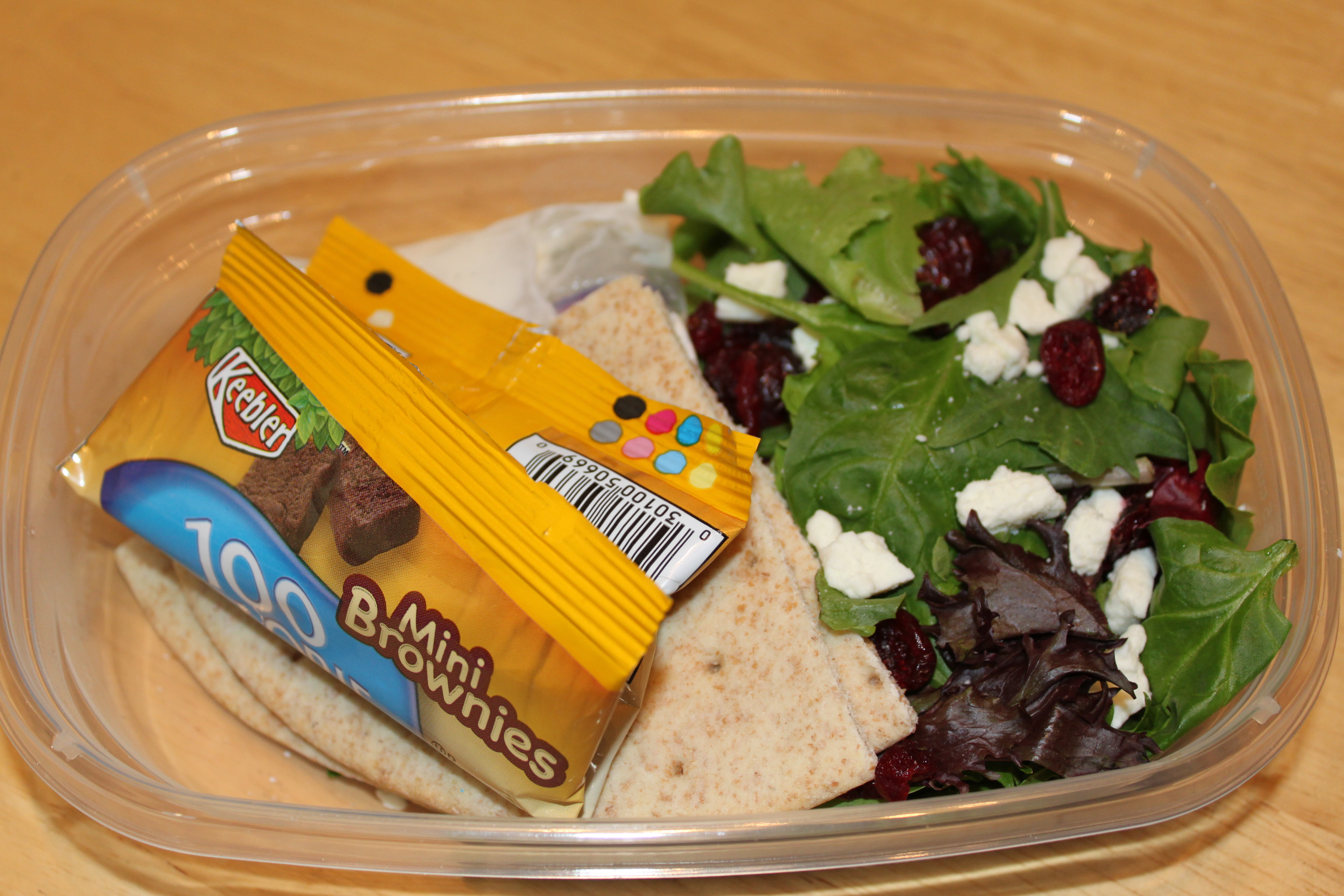 Mixed greens with Feta and craisins, Ranch dressing, 1/2 whole wheat Pita flat bread, 100 calorie pack mini brownies