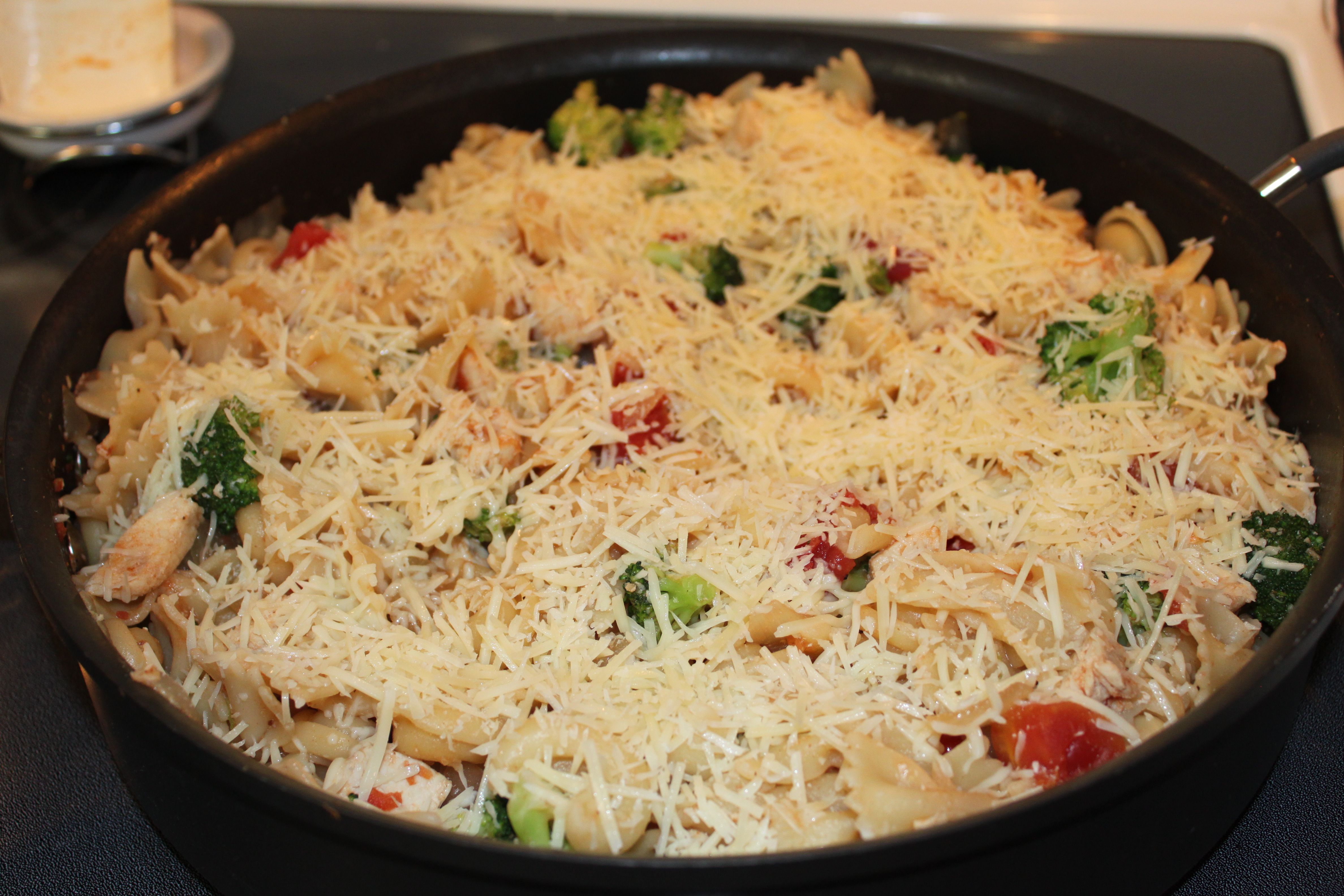 2  Warm remaining oil in skillet over medium high heat.  (Left this out too and sprayed the skillet with Pam Olive Oil instead.)  Add chicken, onion and garlic, sprinkle with salt and pepper; saute 5 minutes.  Add tomatoes; saute 2 minutes.  Toss in pasta, broccoli, Parmesan and 1/2 cup cooking liquid.  Add more liquid if dry.