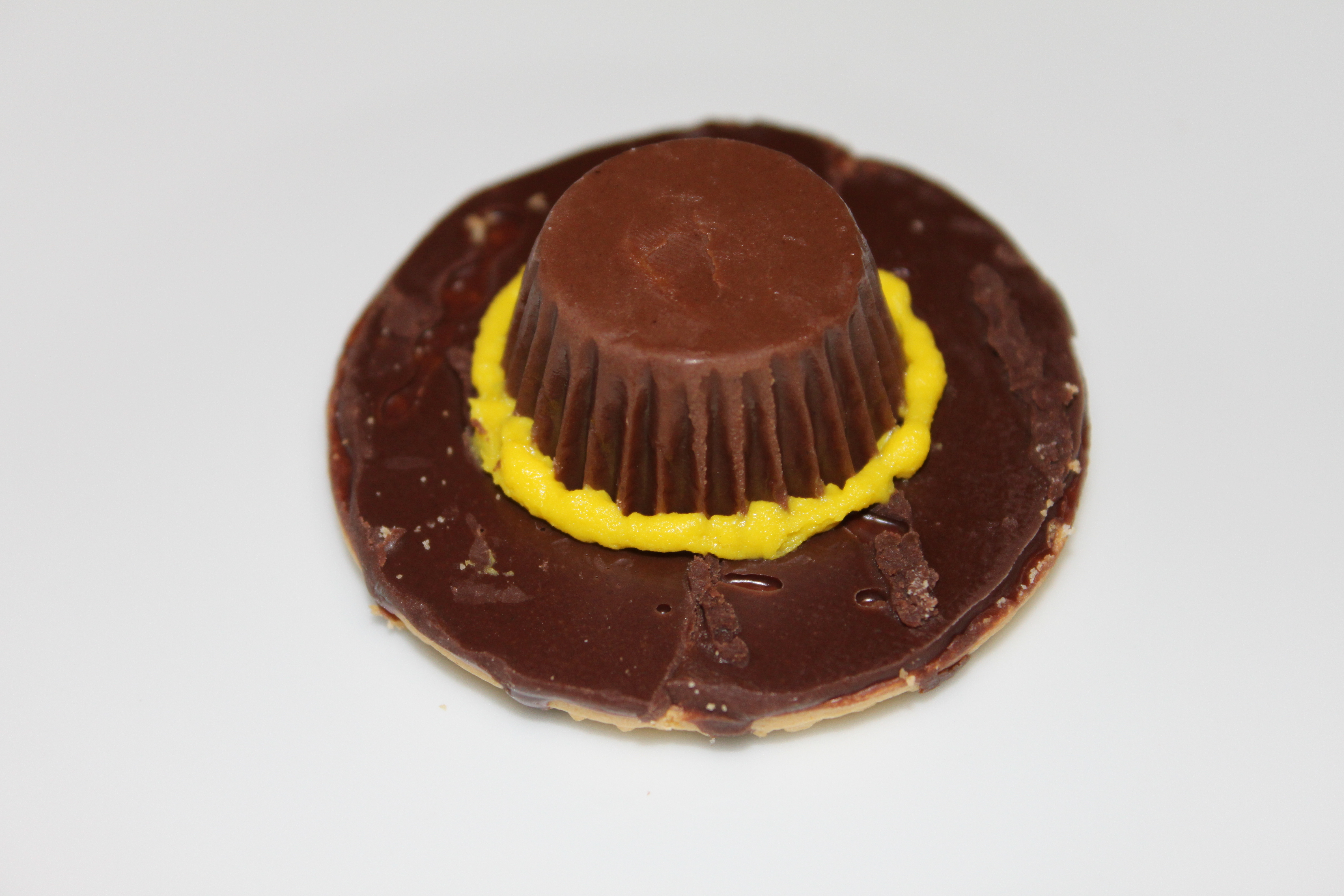 Next up, Pilgrim Hats! This idea comes from a blog called “Dump Your Frump”. All you need are Keeble Fudge Stripe Cookies (on her blog she used those chocolate wafer cookies but Fudge Stripes are a little sturdier I think), mini Reeses Peanut Butter Cups and some frosting (I just bought a tube of that Betty Crocker decorator frosting). So just squirt some frosting around the outer edge of the bigger flat side of the peanut butter cup (which would be the top I guess) and gently press it onto the bottom of the cookie, making sure to cover the hole in the cookie and then using same frosting, make a ring around the seam of the peanut butter cup and the cookie (on her blog she added a buckle with the frosting but we had some time constraints so went without a buckle).