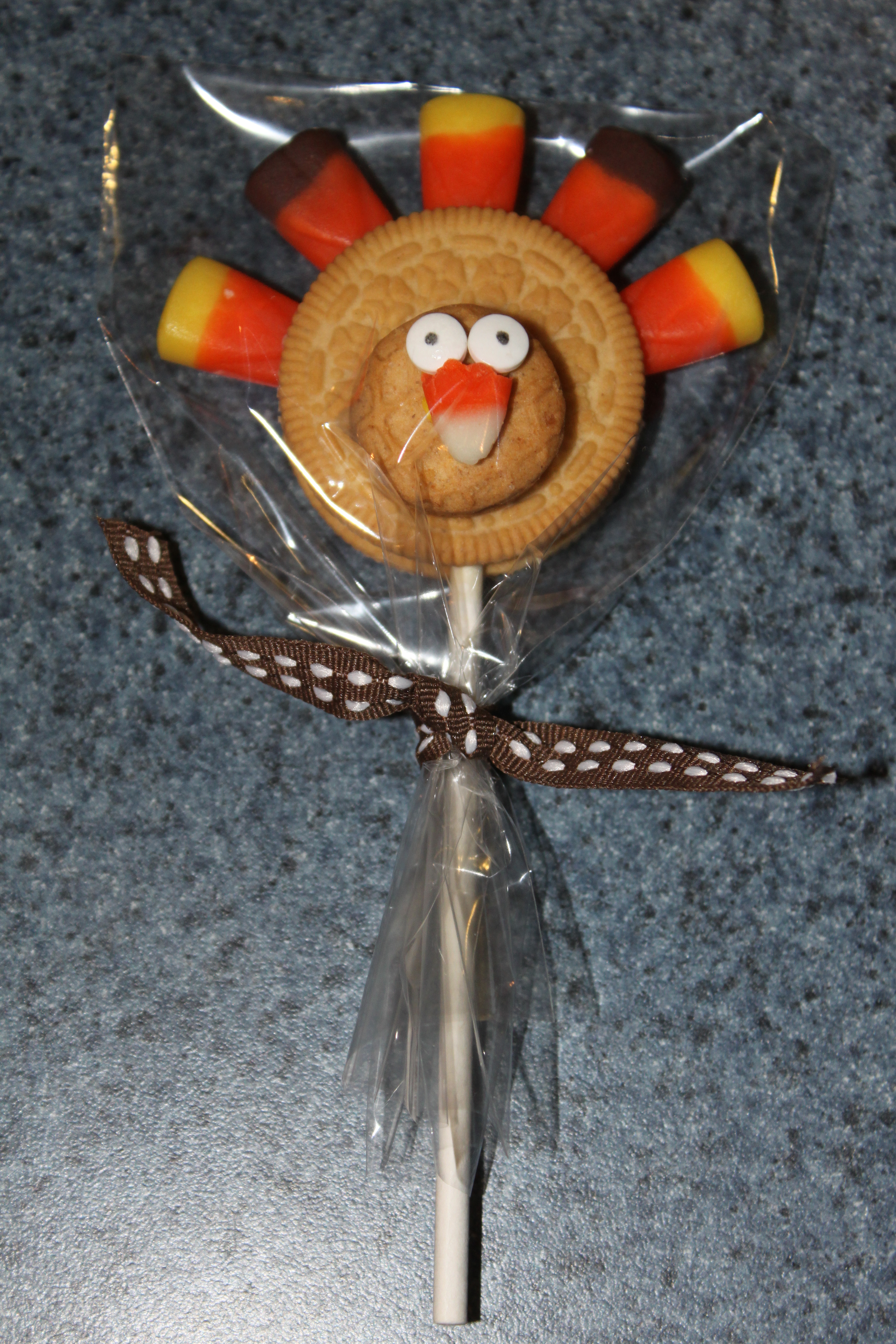 1 Take an Oreo and carefully pull it apart trying to leave all of the frosting on one side. Repeat with another Oreo. Set the 2 sides without any frosting on them aside (for another project or for snacking) and then take the 2 sides with frosting and stick them back together. While holding the cookie between 2 fingers, carefully push the popsicle stick into the frosting, about 1″ in. Now take 5 candy corns and, while still holding the cookie between 2 fingers, carefully push the candy corns into the top of the cookie, on the opposite side of the stick, making a fan like pattern. Set cookie carefully onto work surface.