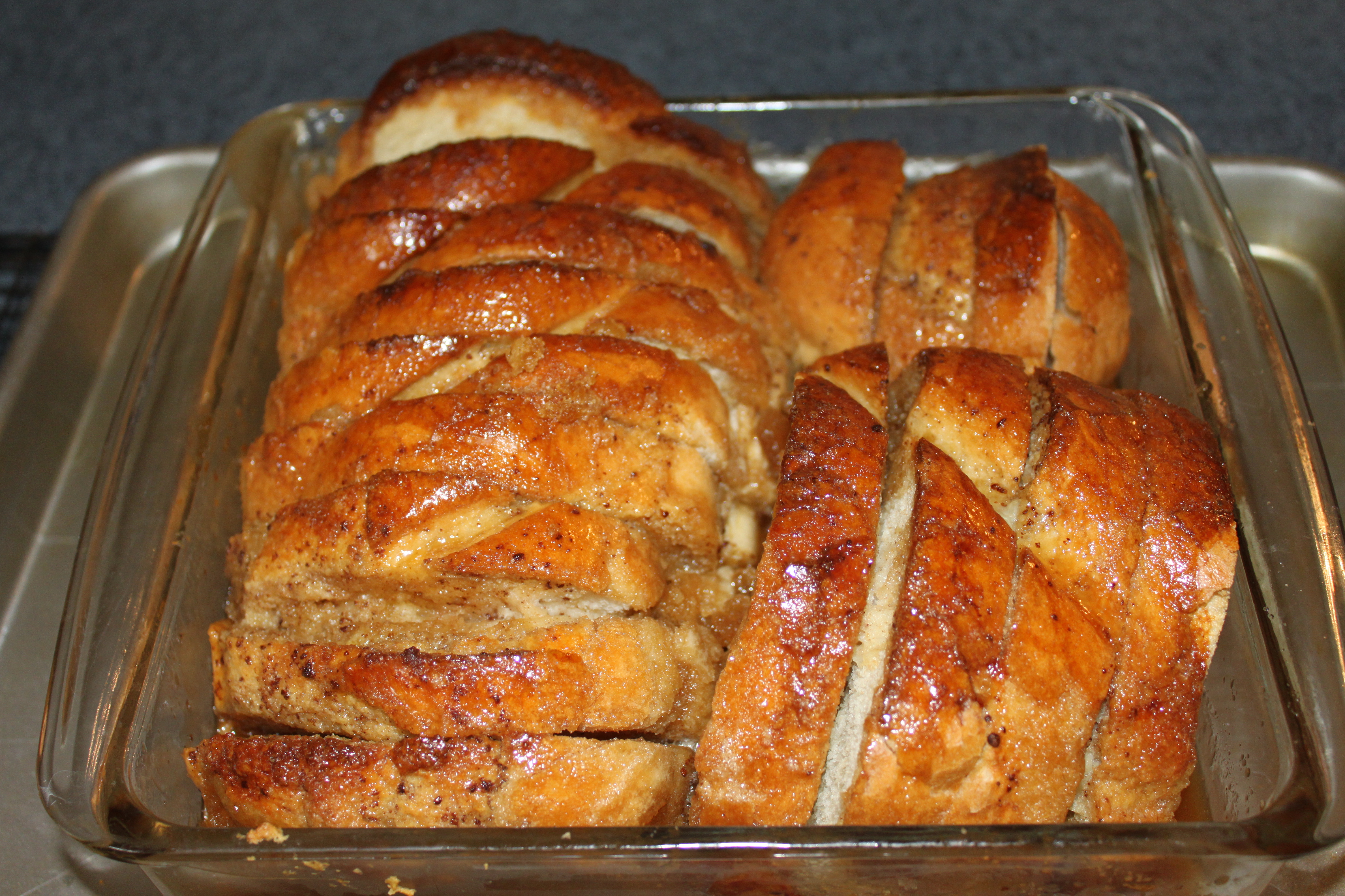 5  Carefully and evenly pour sugar mixture over casserole, covering each slice well.  (I did the same pour and separate with a knife thing here as well.)  Place casserole, on baking sheet, in oven and bake until puffy all across pan like a good bread pudding and is golden and baked through, about 40 -45 minutes depending on how packed your pan is.  The casserole will deflate as it cools.  Serve warm with mixed berries.
