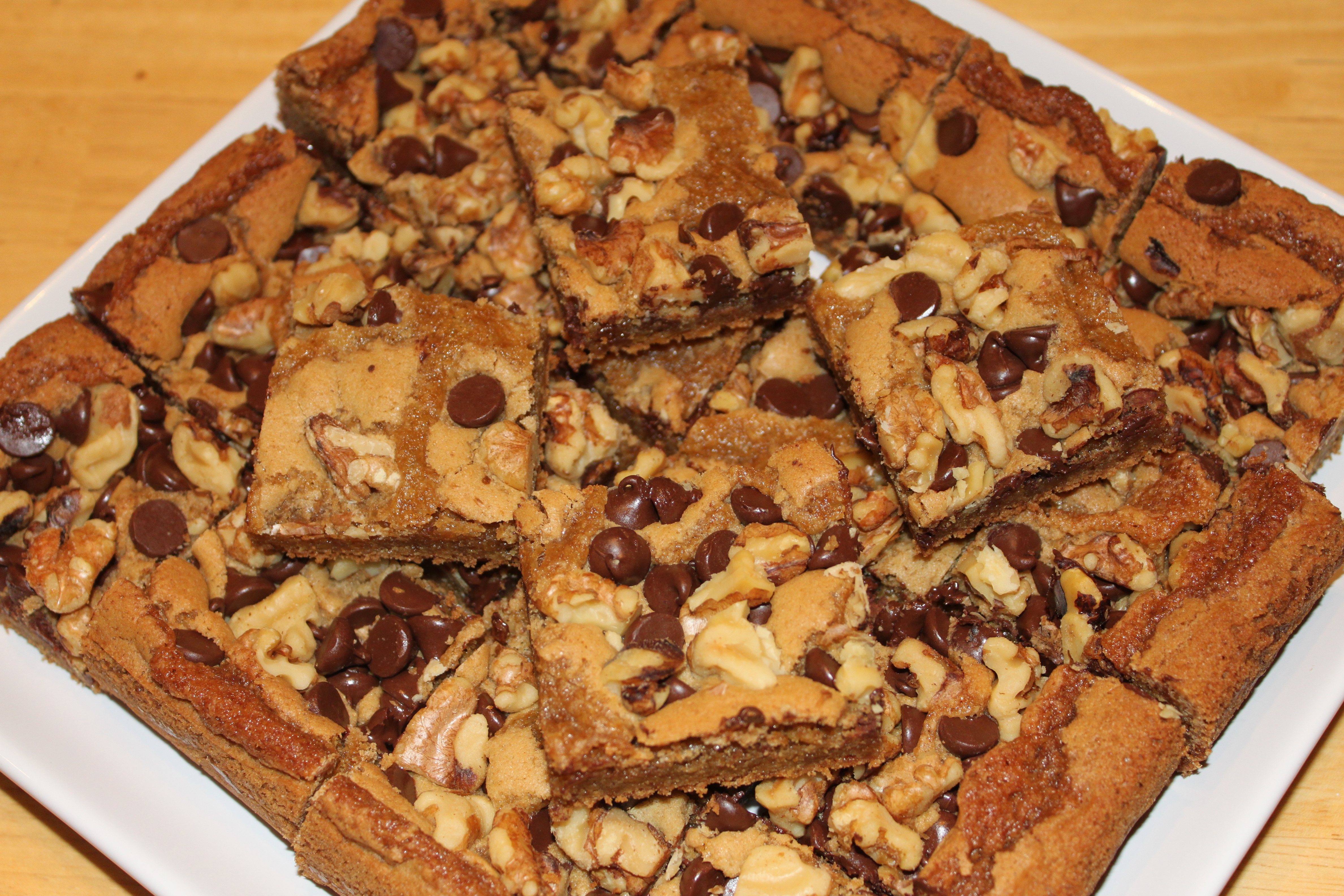 3 Spread batter in prepared pan. Sprinkle chocolate chips and nuts over batter. Bake 25 – 30 minutes until a toothpick inserted in center comes out clean or with a few moist crumbs.