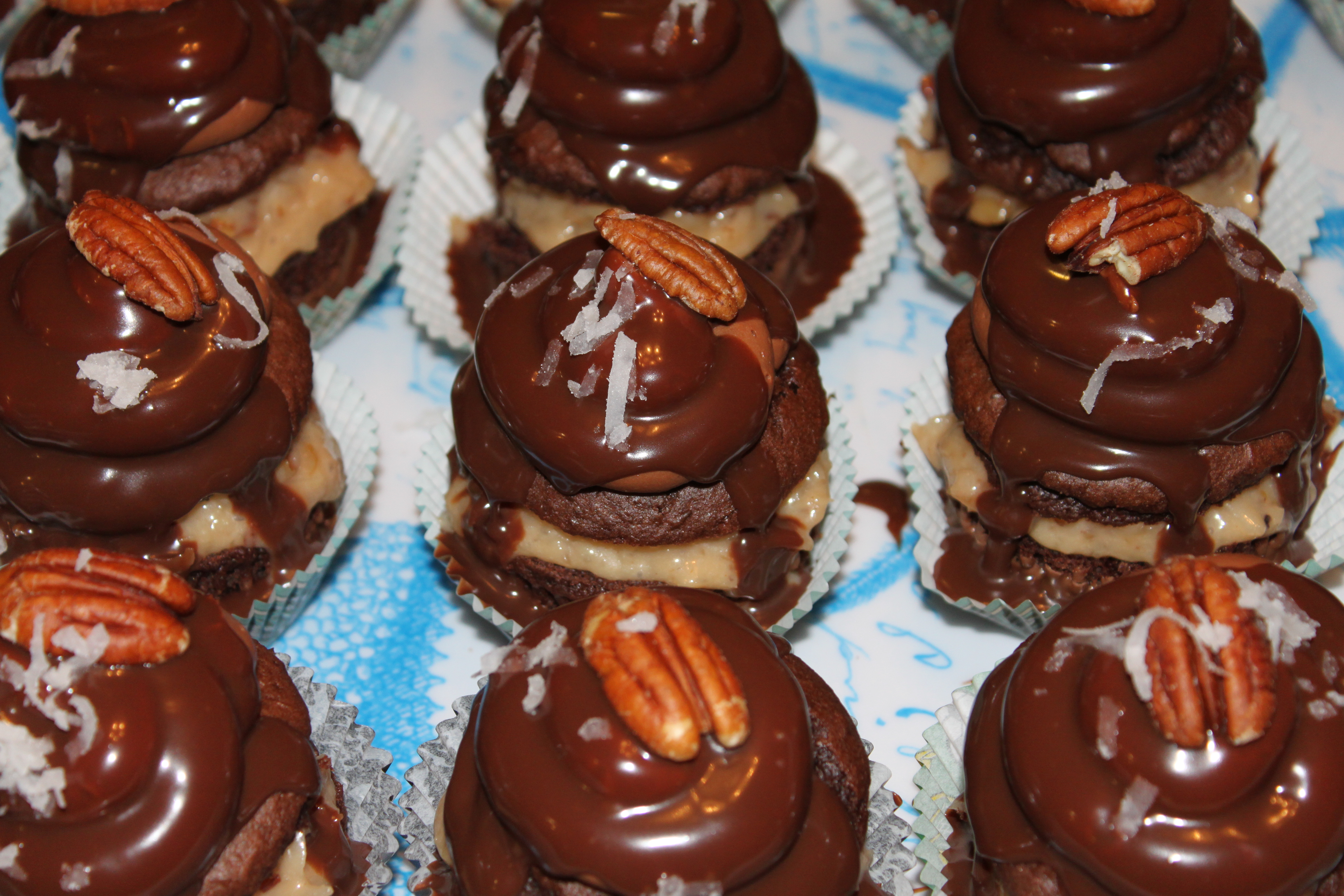 Bake cupcakes and let cool completely.  Carefully peel cupcake liners off of cupcakes.  Dip the bottom of the cupcakes in chocolate (we used chocolate candy melts for this).  Carefully shake excess chocolate off then place dipped cupcake back into a clean liner.  Slice tops off of each cupcake, right where the “muffin top” starts.  I just scooped a dollop of the German chocolate filling onto the bottom of the cupcake and then replaced top, pressing gently to secure (in the class we piped the filling on but I don’t think that’s necessary especially since it get smashed when you put the top back on).  Frost in a circular pattern with the chocolate buttercream then drizzle chocolate ganache on top of the frosting.  I topped with a pecan half and a sprinkle of coconut, in the class we topped them with toasted coconut and chopped pecans.