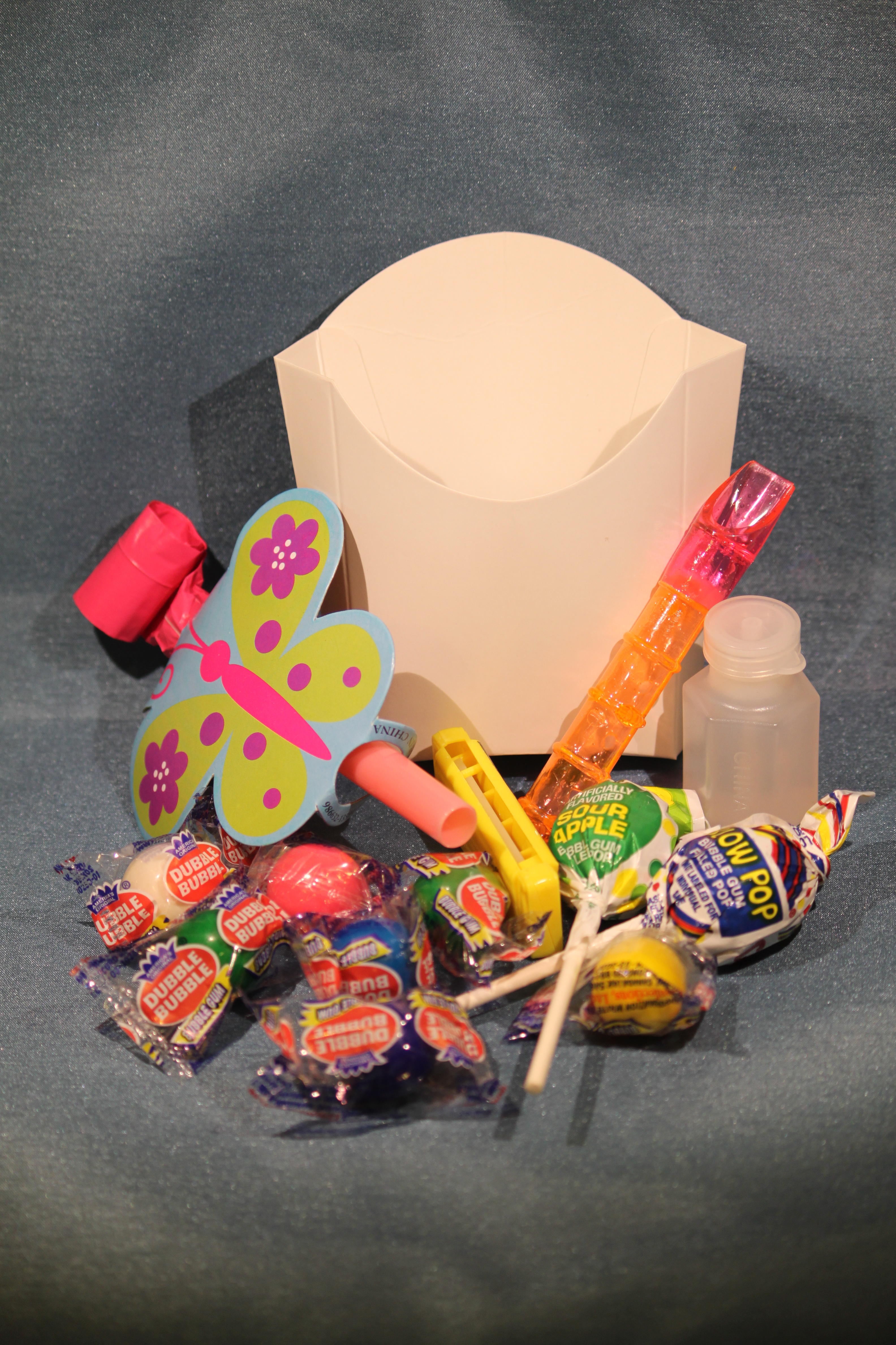Several of the girls from church have events this week such as a huge soccer game, a huge cross country meet and a huge concert and I wanted to let them know that I was thinking about them since I won’t be able to make it to most of these things so I checked out Pinterest and found this cute idea for a gift of encouragement and/or good luck. I can’t give you a link to the original idea because it is one of those pins that is just a picture so here is the link to the picture so you can see the original idea, basically it’s a little gift full of things that blow! 🙂 Here is a closer look at what’s inside which I found all at the Dollar Store: