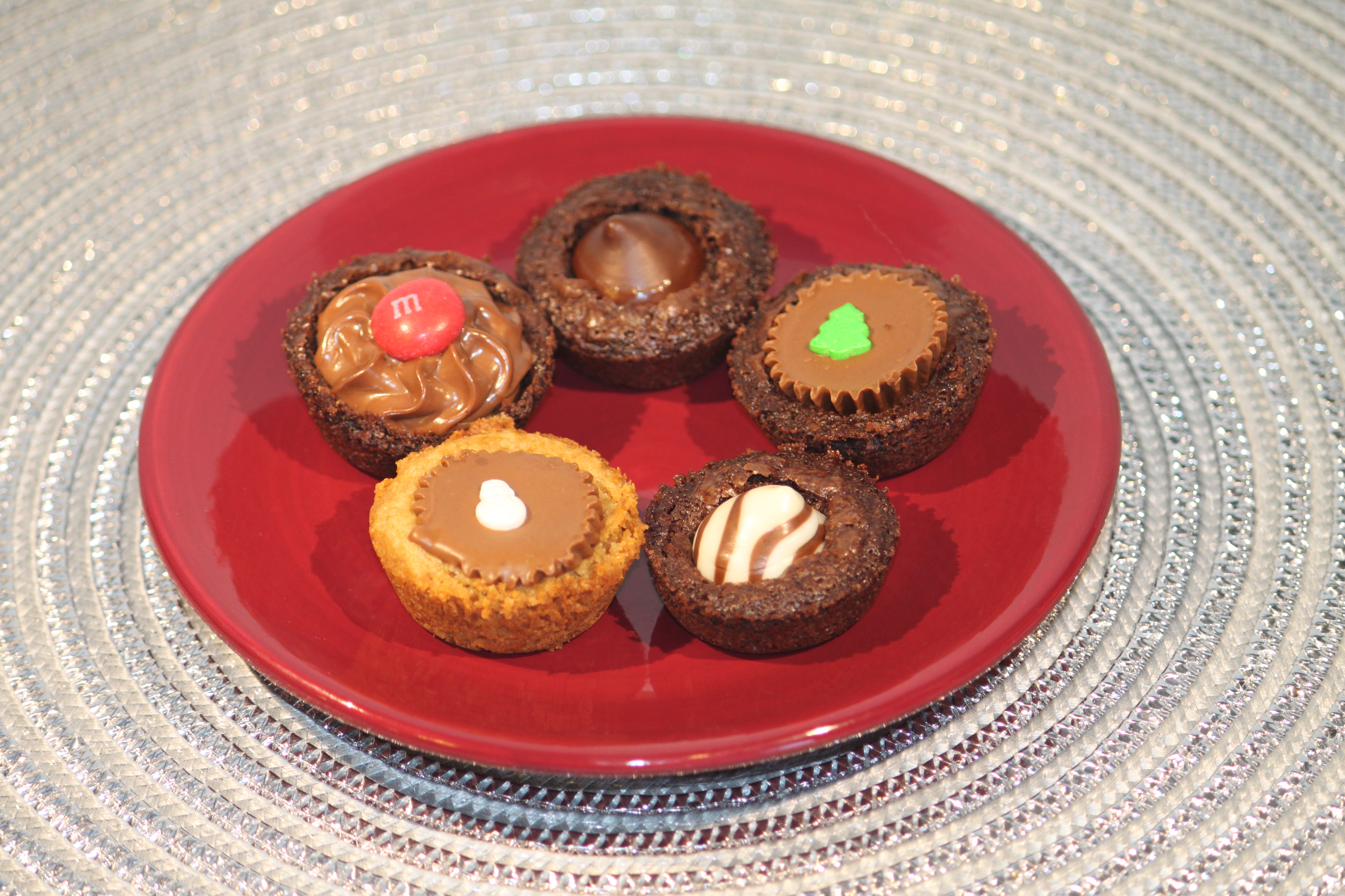 First, prepare a box of brownie mix according to package directions, scoop batter into wells of your mini muffin pan and bake for about 12 – 14 minutes (I made about 5 dozen brownie bites/cups from 1 box). When the brownies bites are fresh out of the oven, I did several different things with them. For 1 dozen of them I pressed Hershey’s Hugs (the white ones in the pic) right into the center of the brownie bite, I did the same thing with a dozen more, this time using Hershey’s Mint Truffle Kisses (the dark Kiss in the pic) and with a dozen more I pressed mini Reeses Peanut Butter Cups into them. (If you like you can add a large holiday sprinkle like I did to the top of the peanut butter cup once it has gotten a little soft.) After you’ve put all the candies in the centers then let them sit in the pans for about 15 minutes before removing. YUM! With the last 2 dozen brownie bites, I made them into brownie cups by pressing them with the Pampered Chef tart shaper right when they came out of the oven, I then let them sit in the pan for 15 minutes before removing and then when they were completely cool, I piped Nutella into them with my Pampered Chef Easy Accent Decorator and then topped them with a Mint M&M.
