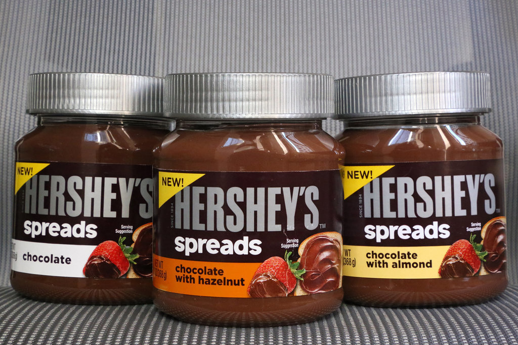 First I baked a batch of yellow and a batch of chocolate cupcakes in these cute green and dark pink polka dotted cupcake liners that I got from my favorite website in the whole world called “Pick Your Plum” (sorry that you can’t really see them in the pictures but trust me they are cute and springy!) then once the cupcakes were cool, I frosted them with these tasty Hershey Spreads in chocolate and chocolate with hazelnut (you can find them with the peanut butter at the grocery store):
