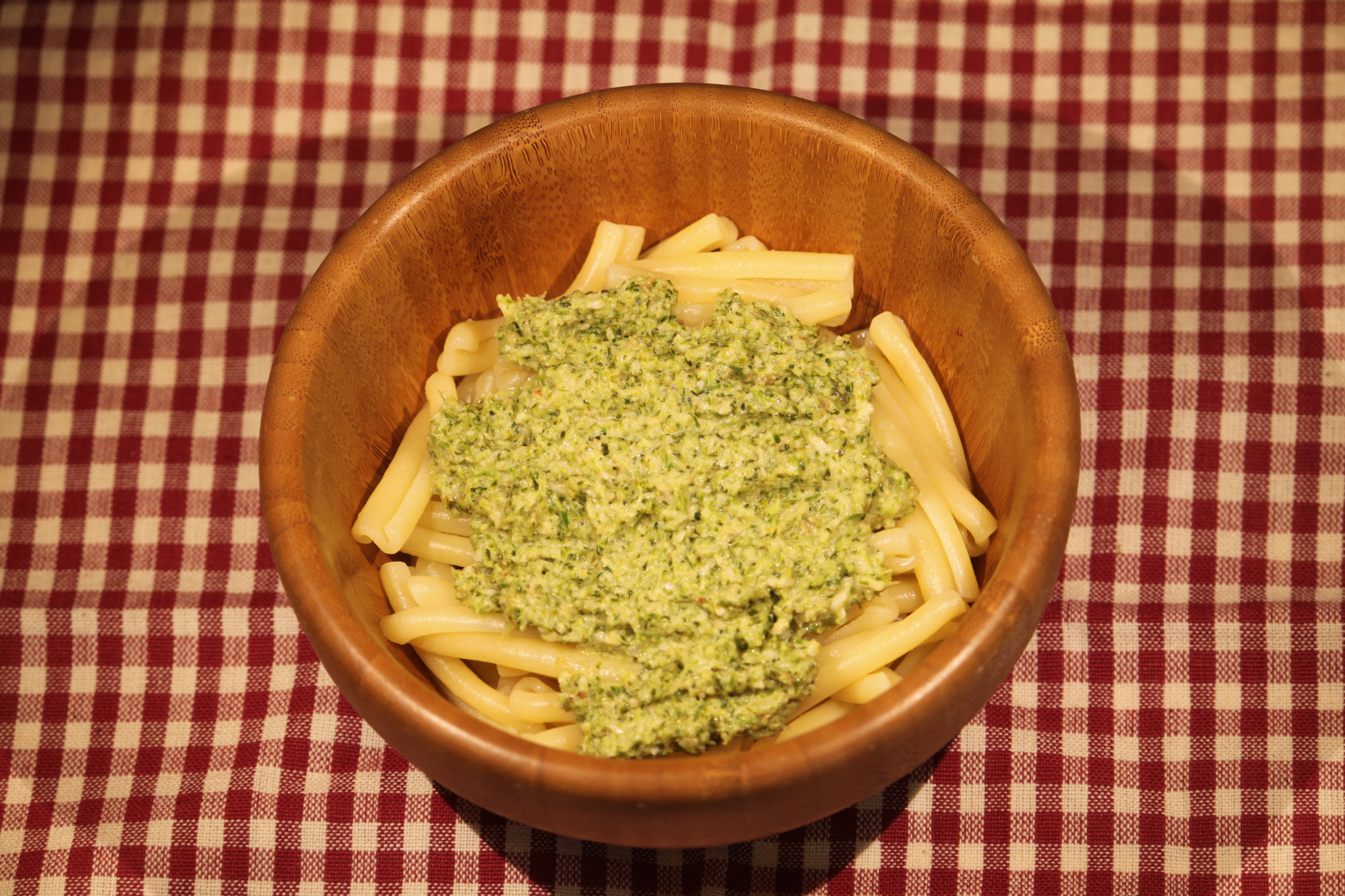 2 In food processor or blender, combine broccoli, walnuts, garlic, lemon juice, and salt. Pulse until broccoli and nuts are finely chopped. Then, with motor running, pour in olive oil in slow stream. Mix in grated cheese.