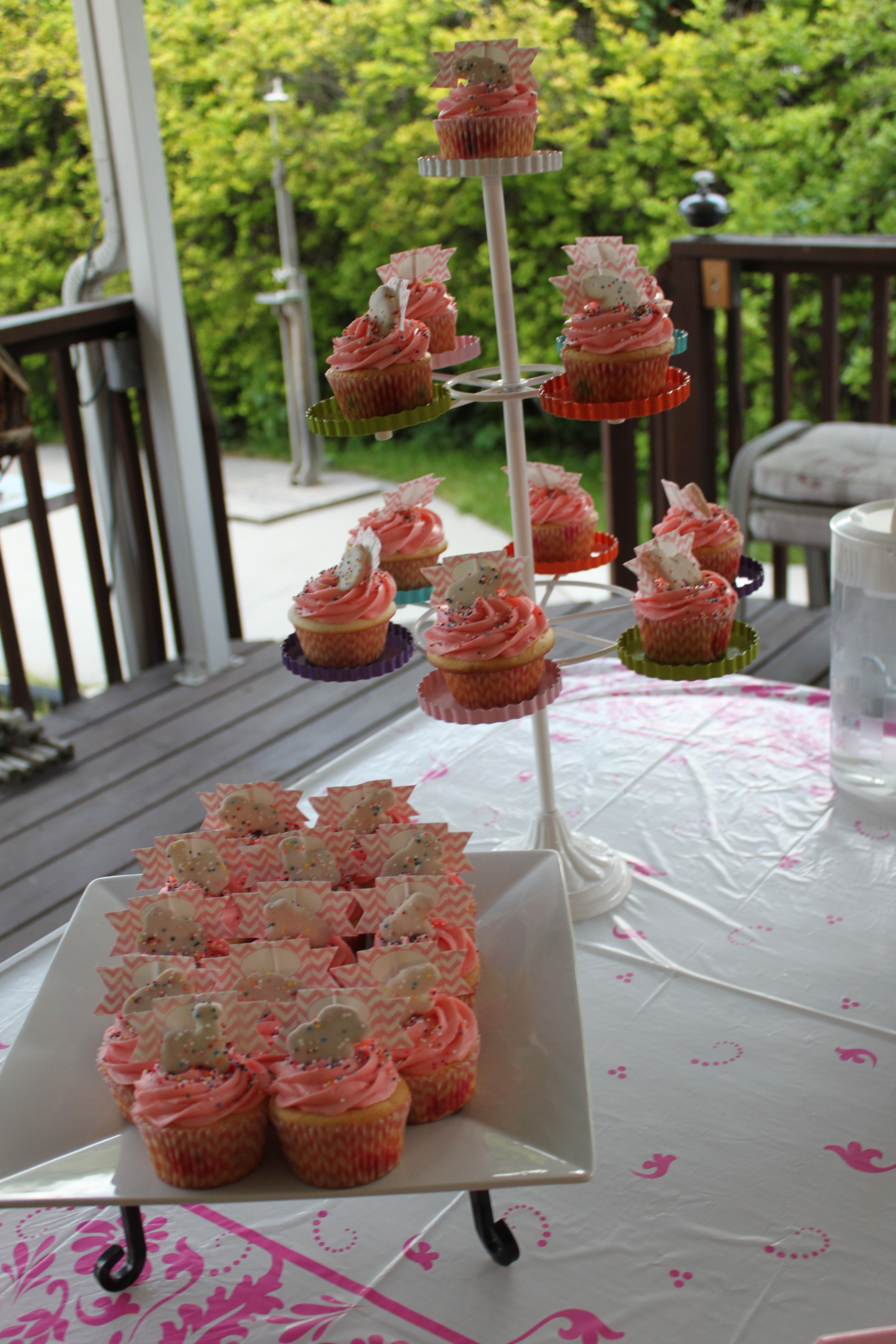 So I did one batch with a Pink Lemonade cake mix, frosted with the buttercream icing left white, a pink Circus Animal Cookie on top and then finished with multicolored round sprinkles to match the sprinkles on the cookies.
