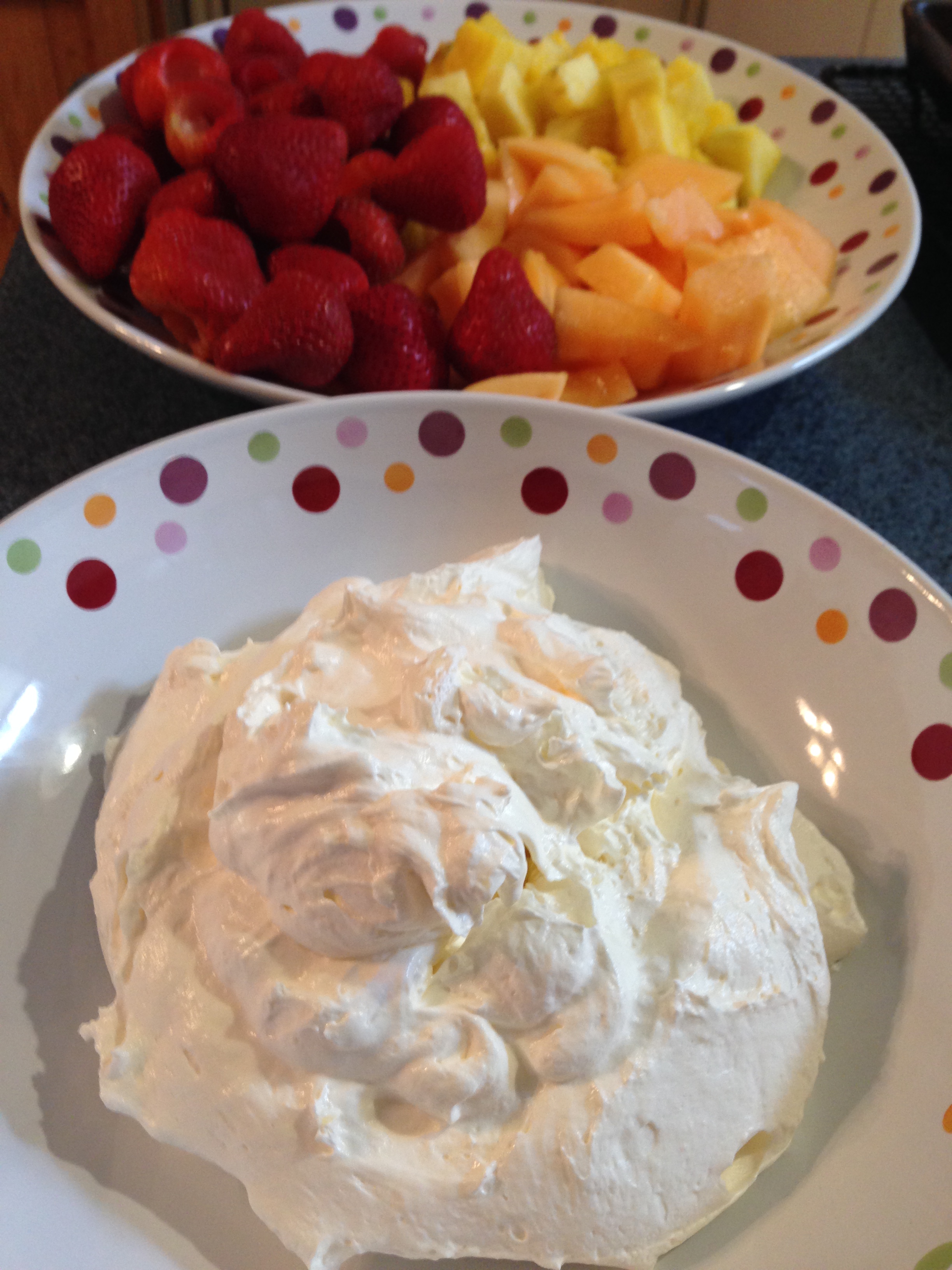 I made Bob a big dinner for Father’s Day – bacon wrapped filets (from Costco), Oven Fries, Broccoli Salad and Cheesy Garlic Bread and then for dessert, this tasty (and super easy!) dip with fruit.  It was delicious with the fruit but I bet it would also be really good on a piece of cake or pie or a brownie, you get the idea!