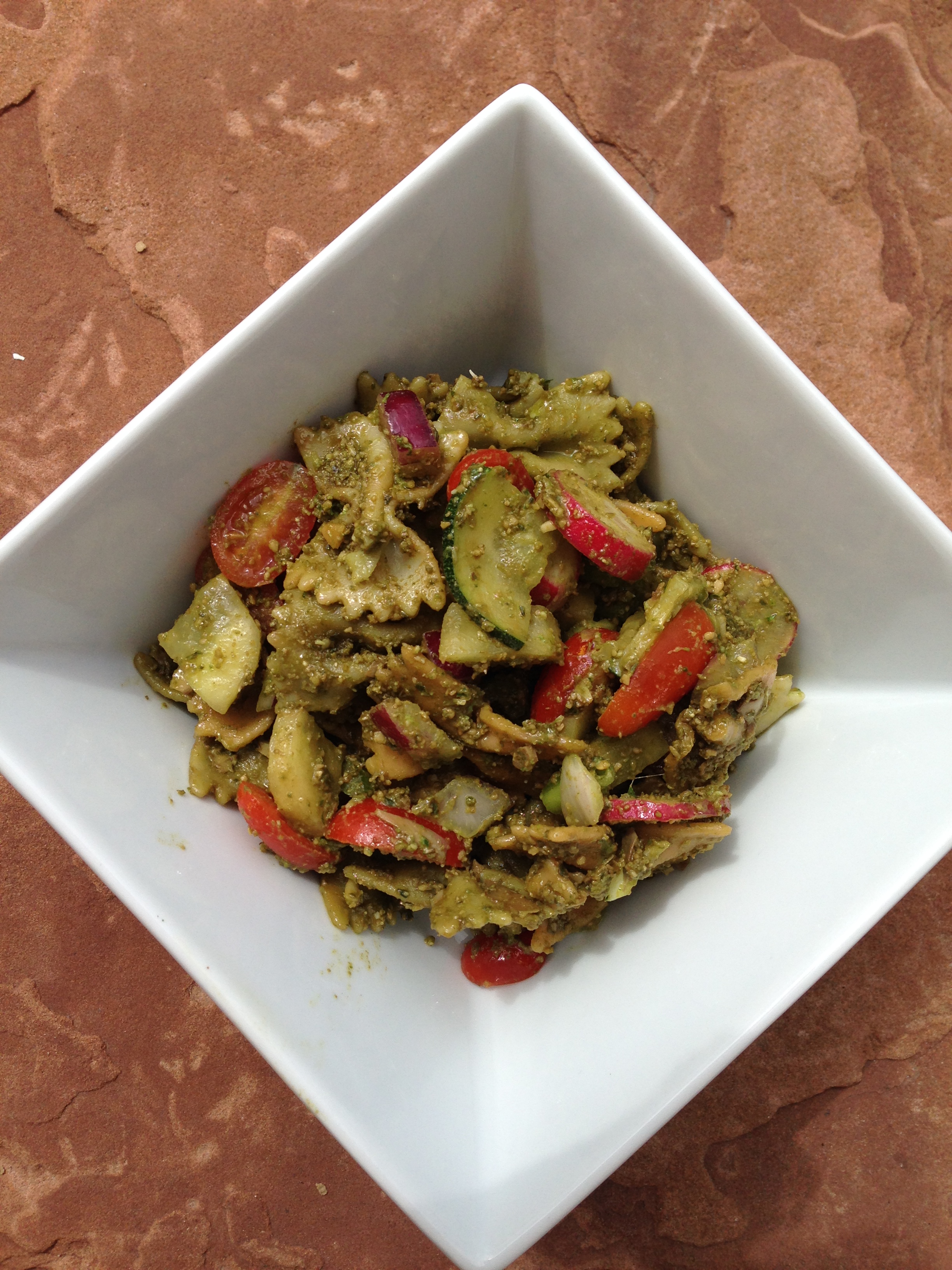 So as you might imagine, there has been a lot of pesto around here lately. I really like to eat it cold so the other night I threw together this pasta salad. Enjoy!