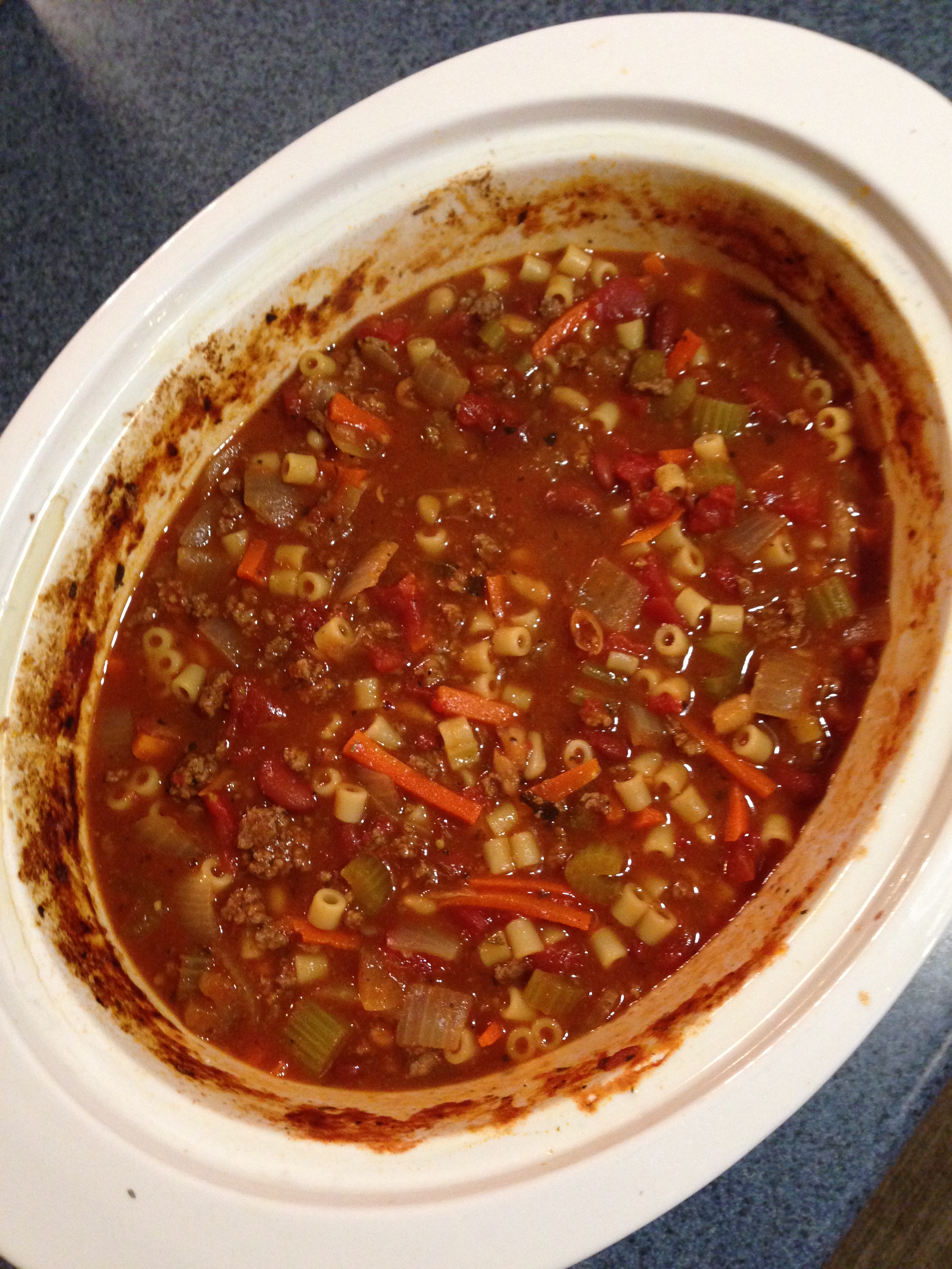 (So here’s what I did – I browned the ground beef then added everything except the pasta to my crock pot and cooked it on high for about 6 hours. I cooked the pasta according to package directions and added it to the soup right before serving. I also add another cup of V8 with the pasta because after adding the pasta the soup was incredibly thick.)