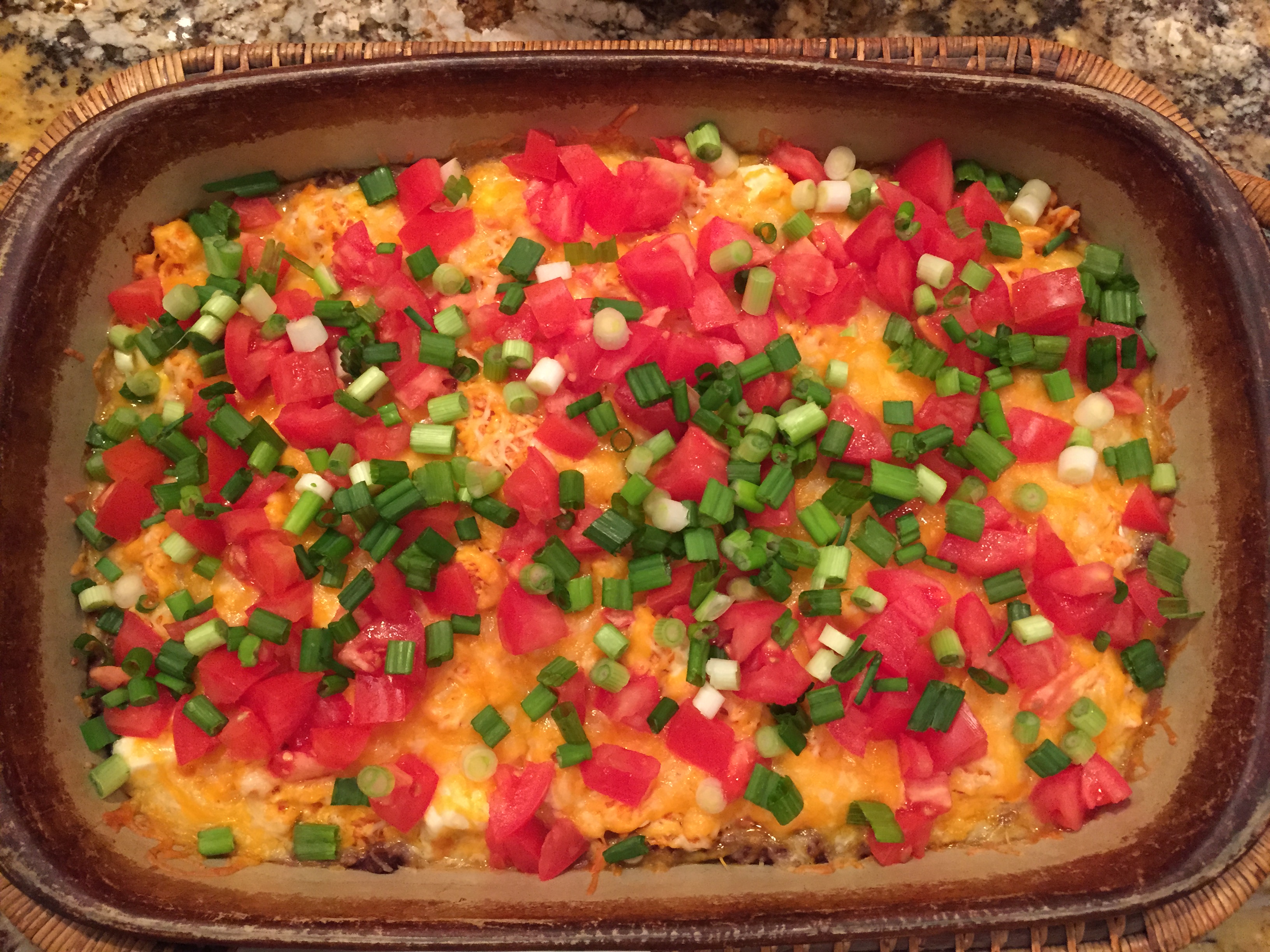 (I skipped the sour cream, avocado and cilantro and topped mine with 3 chopped tomatoes and 1 bunch chopped green onions)