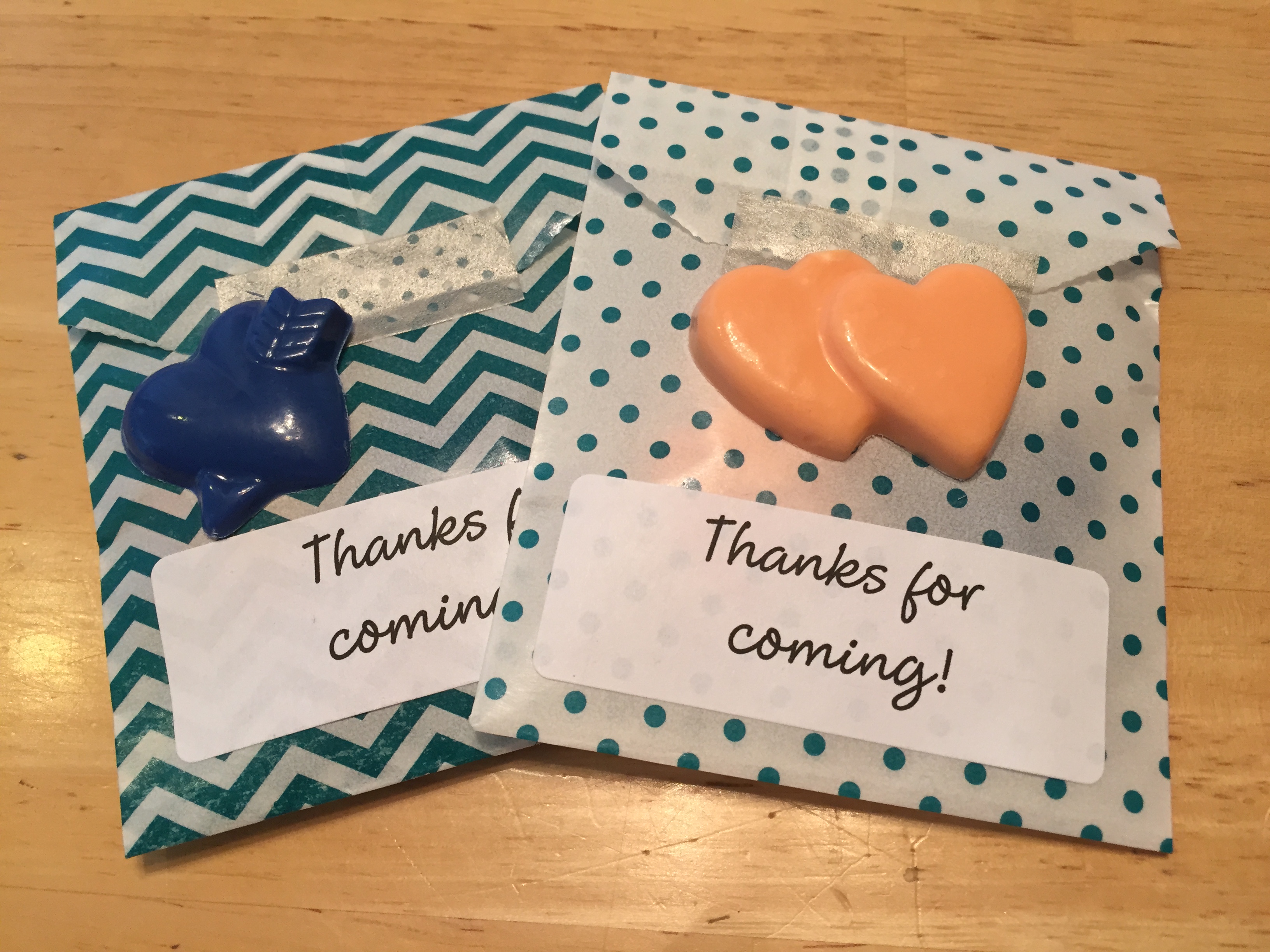 While I was making the cupcake toppers, I made some little chocolate hearts in dark blue and peach as takeaway gifts using Wilton candy melts and some Valentine heart shaped molds. The little green bags (didn’t have any appropriate sized bags in the wedding colors) came from the big craft sale near me in the old Kmart building and the Washi tape (in grey) came from Pick Your Plum, one of my all time favorite websites! Some labels printed off and these were good to go.