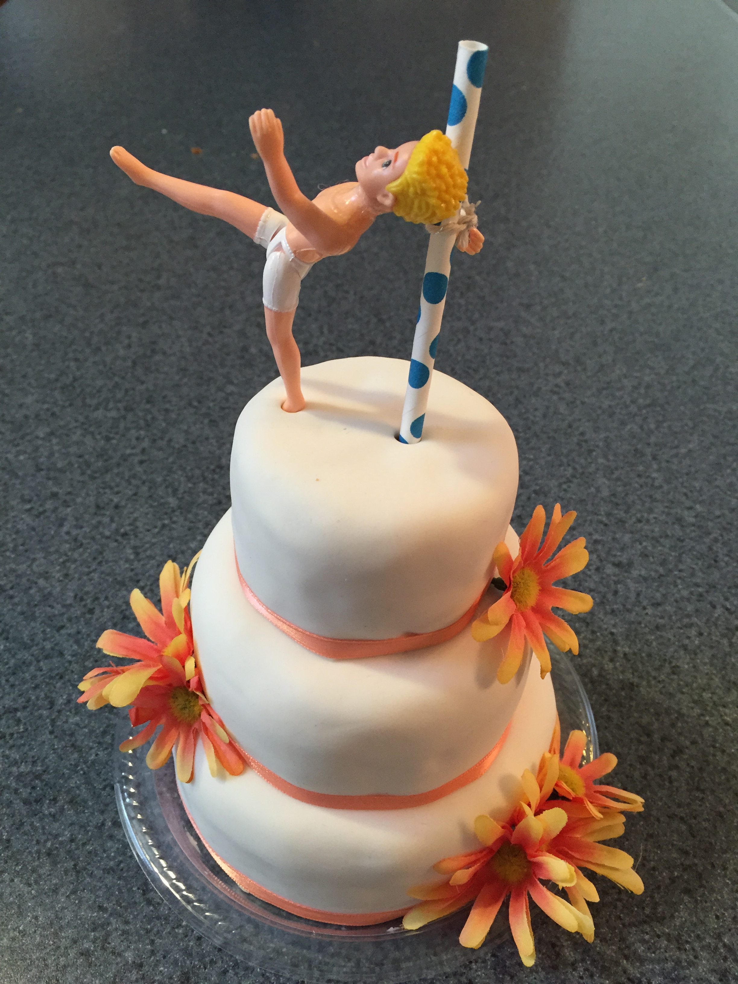 Up next, a mini stripper cake of course, apparently we are stripper cake decorators now! This cake it is only about 6″ high, the bottom layer is about 6″ across, middle is 4″ and top is only about 2″, so it’s tiny. The cake is Brown Sugar made from the White Almond Sour Cream cake recipe with brown sugar subbed in for the white, the infamous Buttercream Icing (see link above), Wilton White Fondant which you can buy at Michaels, some peach ribbon around the layers and some flowers to adorn, both also from Michaels and then to finish a paper straw “pole” and a Polly Fashion little dude for the stripper and that’s enough about that I think.