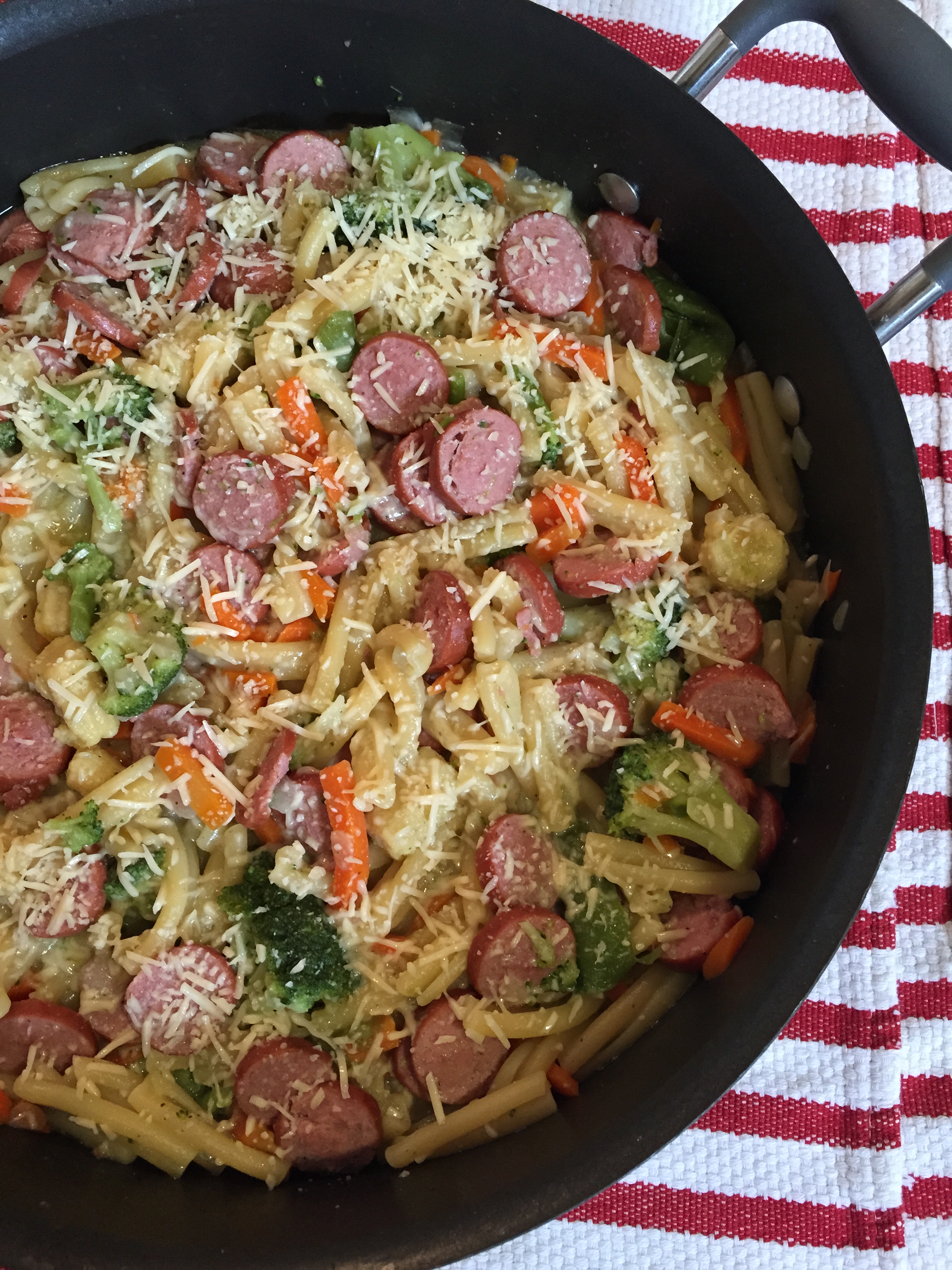 1 Heat oil in large skillet over medium high heat. Add sausage and onion and cook until browned and softened, about 3 – 5 minutes. Add in vegetables, broth and milk then stir in pasta.