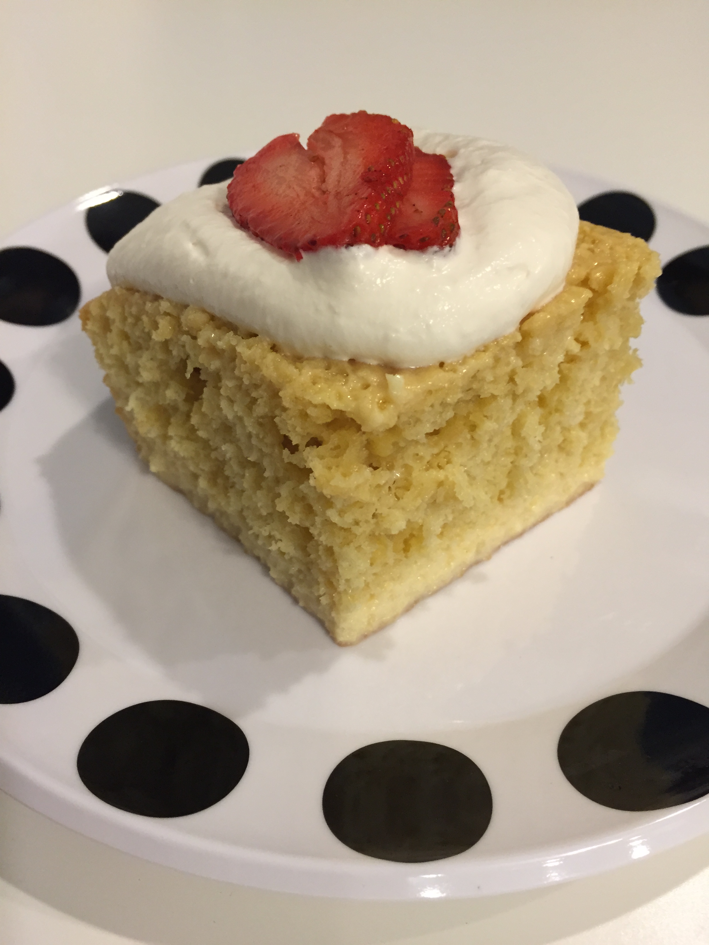 4 Stir together sweetened condensed milk, evaporated milk and whipping cream then pour over top of cake. Cover and refrigerate for at least 1 hour or until mixture is absorbed into cake. Top with whipped cream and strawberries.