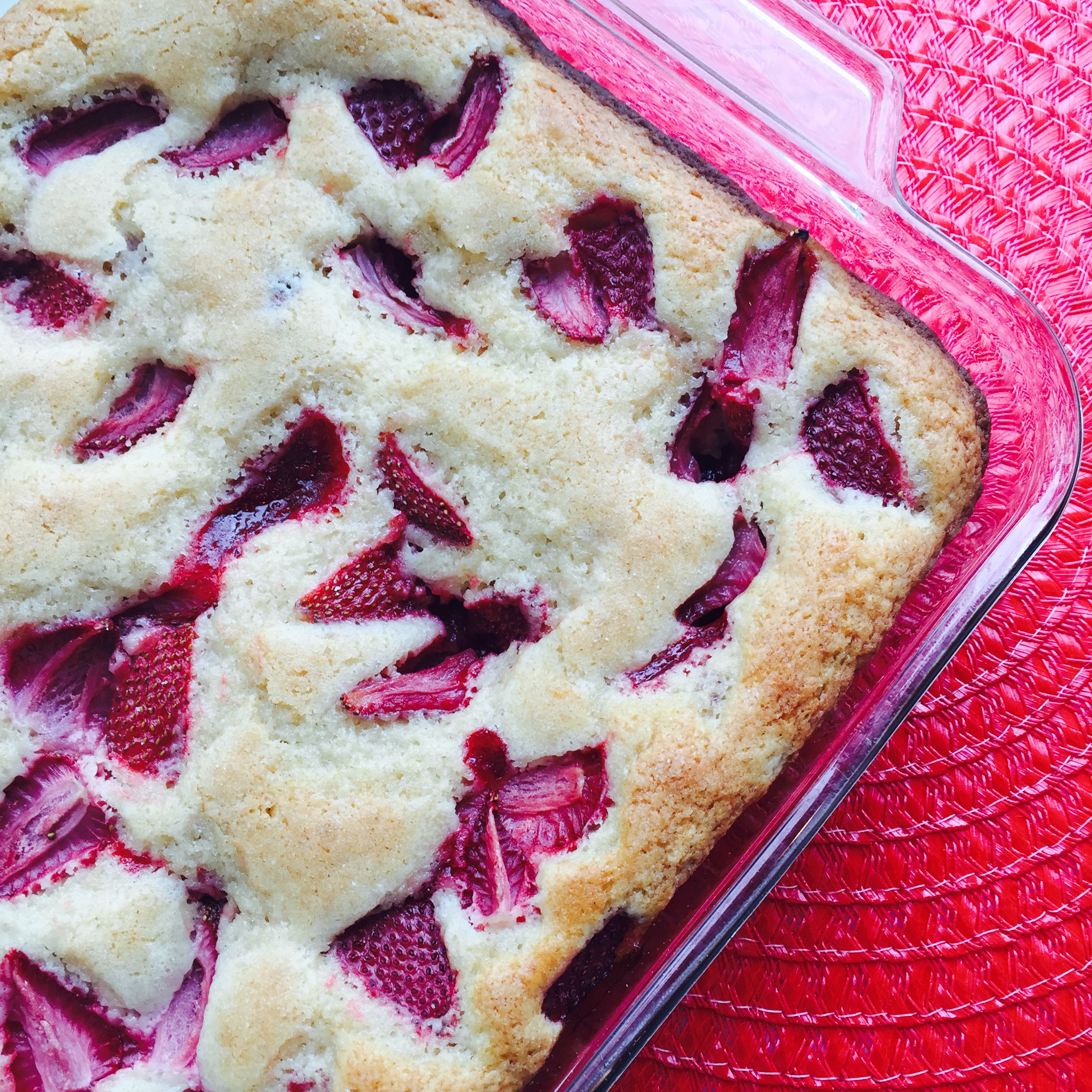 3 Pour batter into pan, spreading evenly. Stir jam until smooth then dollop over top of batter. Sprinkle with strawberries and remaining 2 teaspoons sugar.