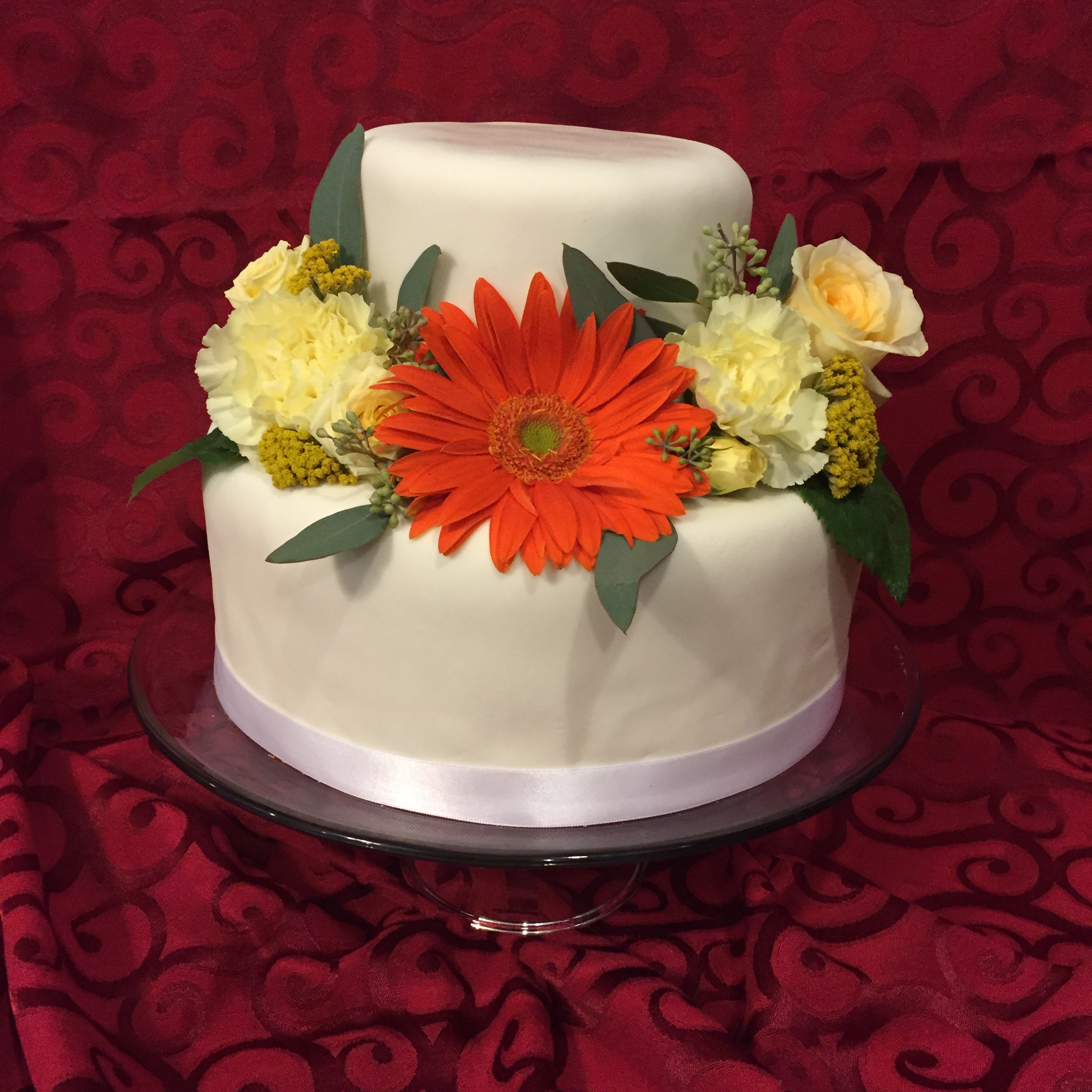 Our latest wedding cake for our friends Josh and McKann who got married on Thursday. They wanted a simple cake, not too big, not too fancy, with flowers to match the bouquets and decorations so here is our contribution. The bottom layer is actually fake and the top layer is brown sugar cake (adapted from the White Almond Sour Cream cake recipe, just replace the sugar with brown sugar) with our favorite buttercream icing and then Wilton brand fondant from Michaels. I love the Gerbera Daisy on this cake, such a cute focal point. Congratulations to Josh and McKann! And thanks for letting us be a part of your big day!