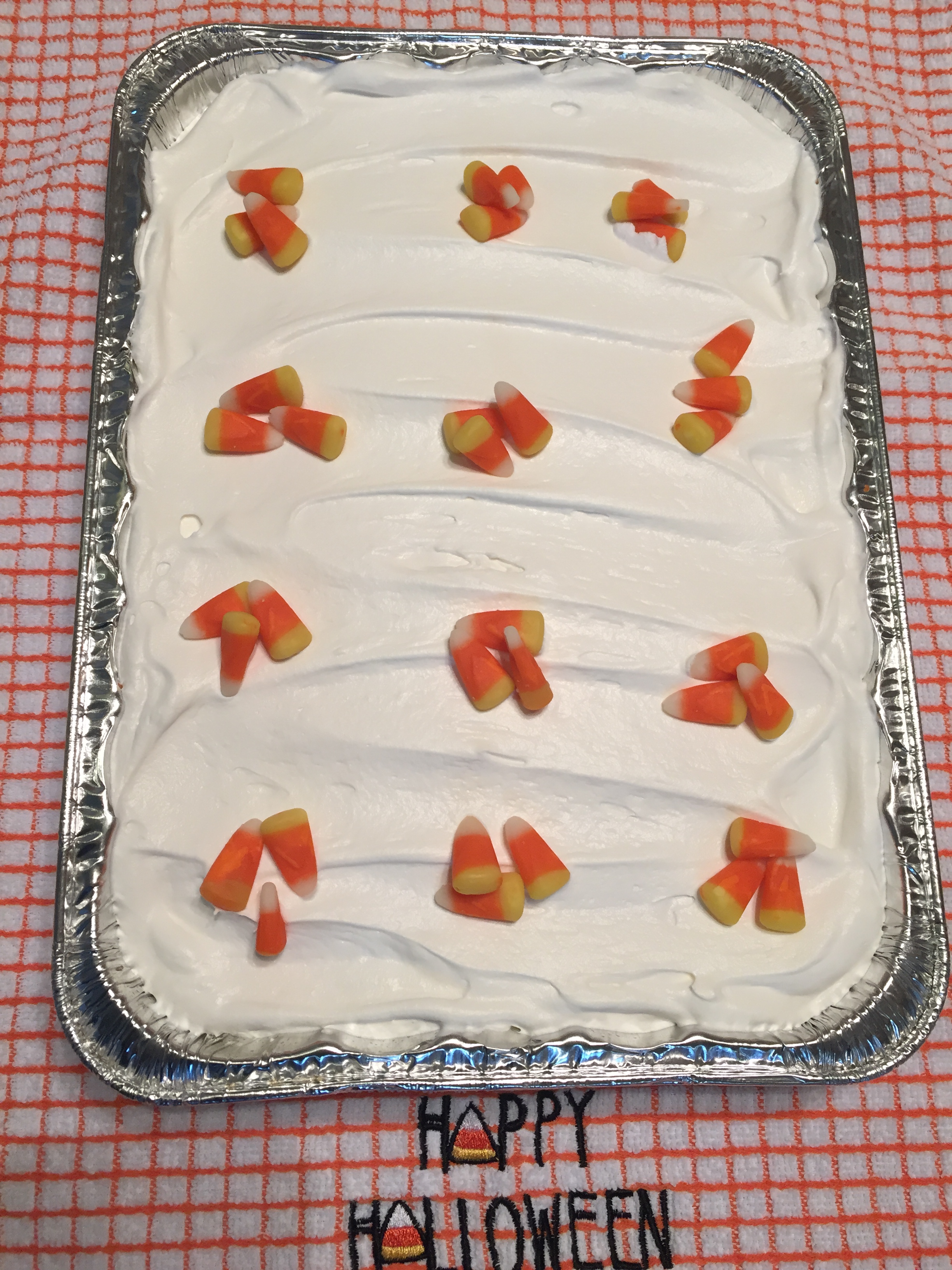 6  Refrigerate overnight or until cake absorbs milk.  Right before serving spread Cool Whip over top and then sprinkle with candy corn.