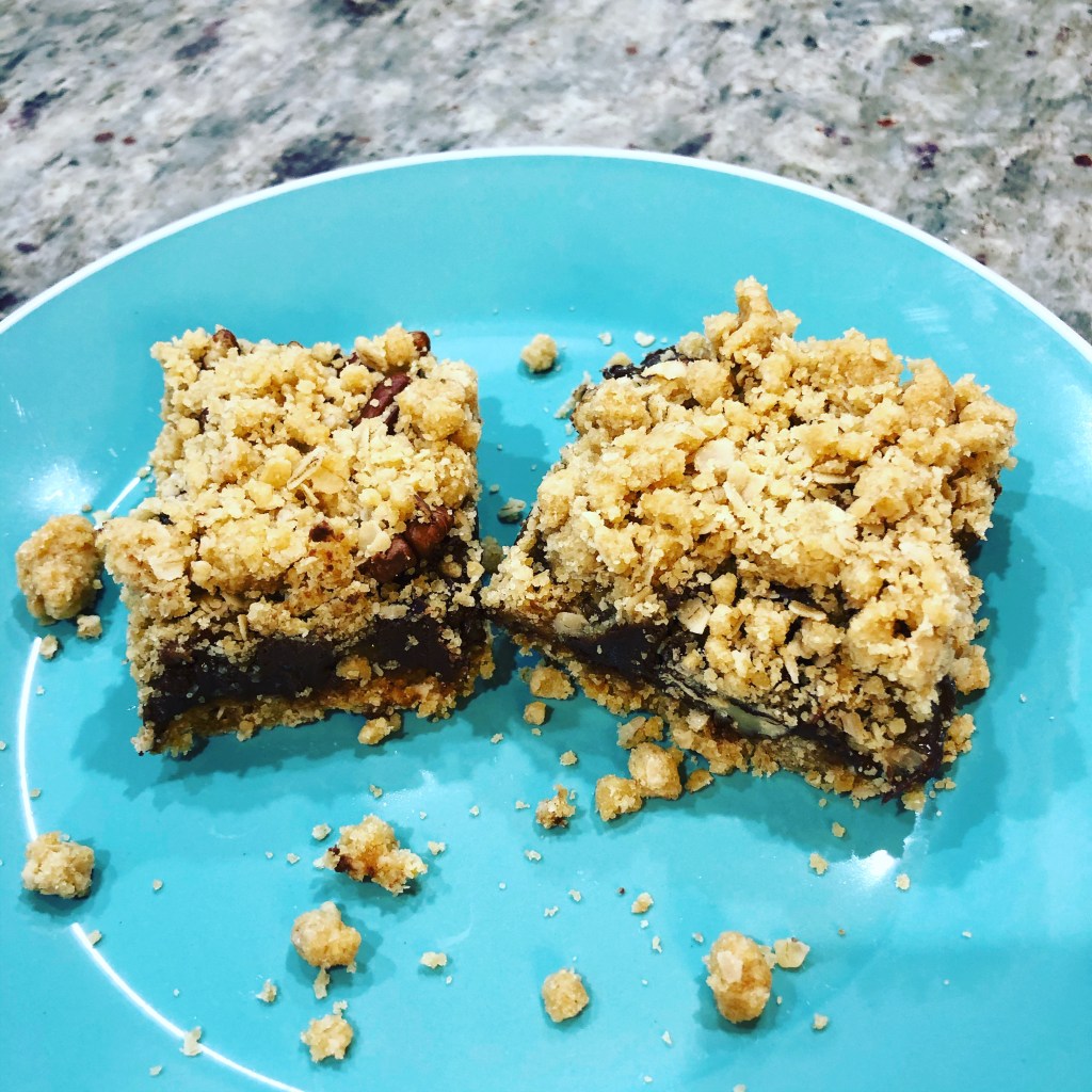 4 Sprinkle chocolate chips and pecans over crust in pan. Drizzle evenly with caramel. Sprinkle with reserved crumb mixture.