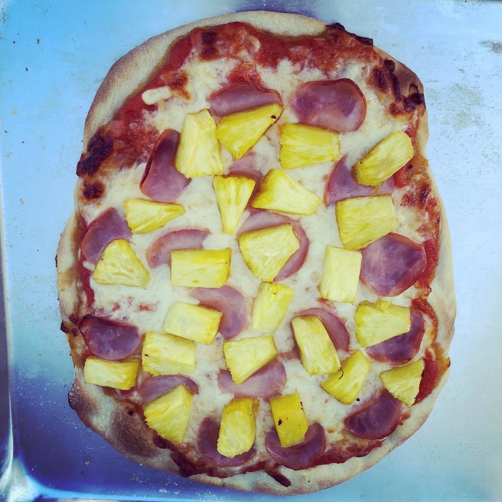 Ham and Pineapple Pizza – spread a layer of sauce over crust, top with shredded Mozzarella, ham slices and sliced fresh pineapple (cut the pineapple prior to use and let sit on paper towels to get as much moisture out as possible)