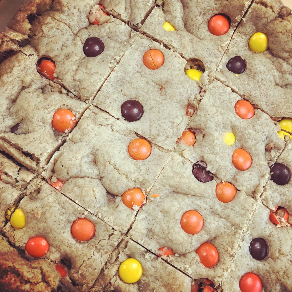 3 Spread dough in pan and top with remaining Reese’s Pieces, gently pushing them into the dough. Bake 25 – 30 minutes or until edges are lightly browned and middle looks dry and does not sink when gently pressed. Let cool before cutting into bars.