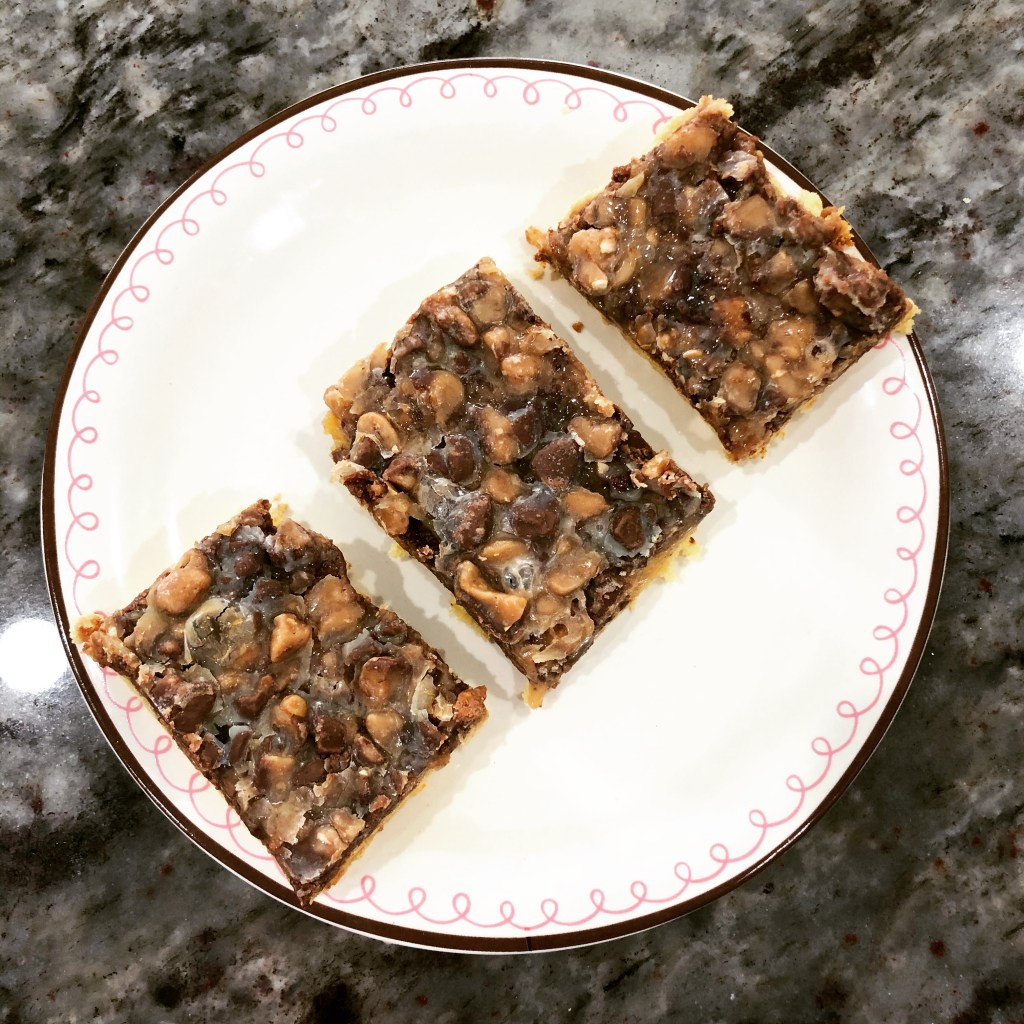 3 Sprinkle toffee over base layer then drizzle with sweetened condensed milk.