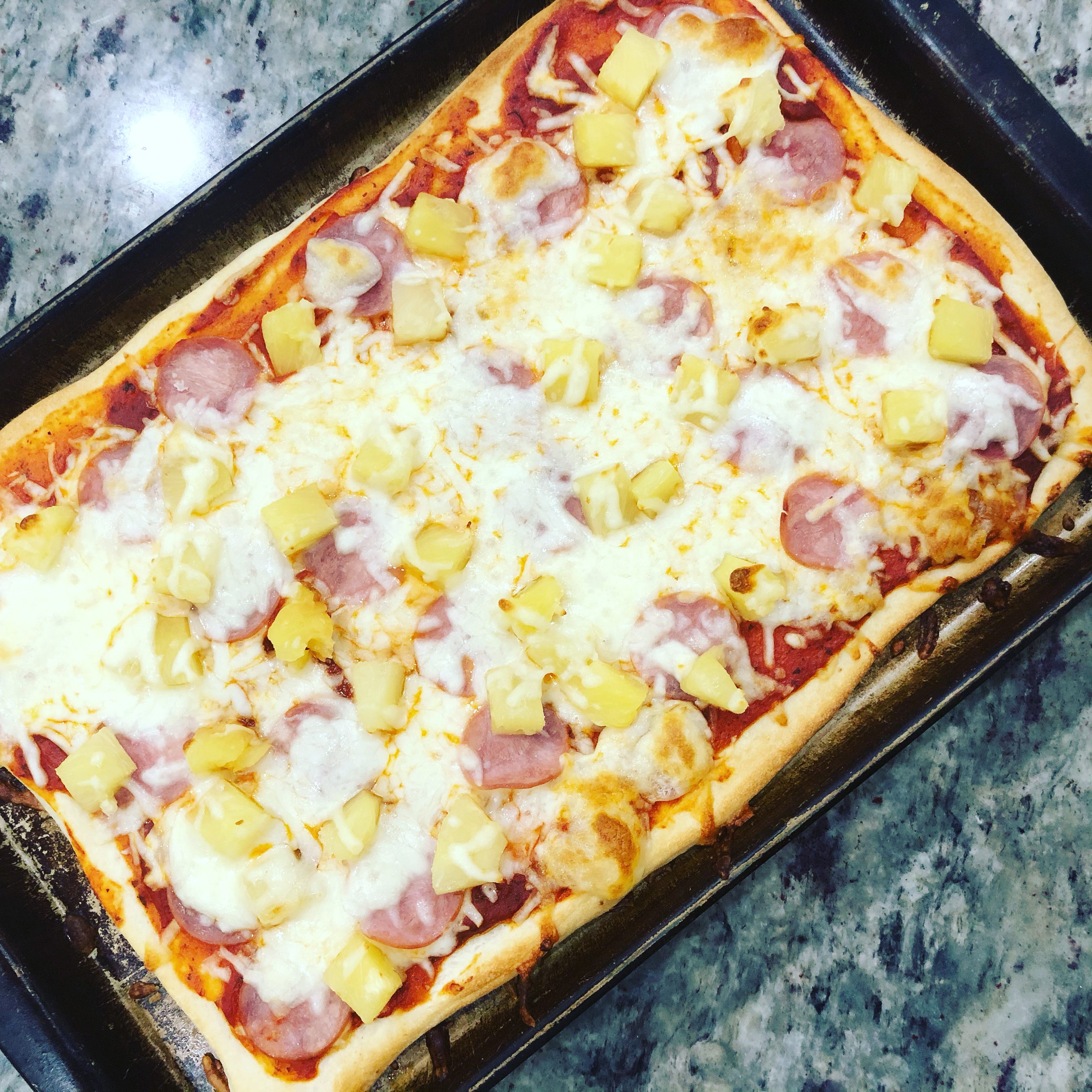 The hubs loves ham and pineapple pizza while the rest of us are kind of meh on it but I love him so I made him this for dinner last night and you know what? There weren’t any leftovers and he did not eat the whole thing.
