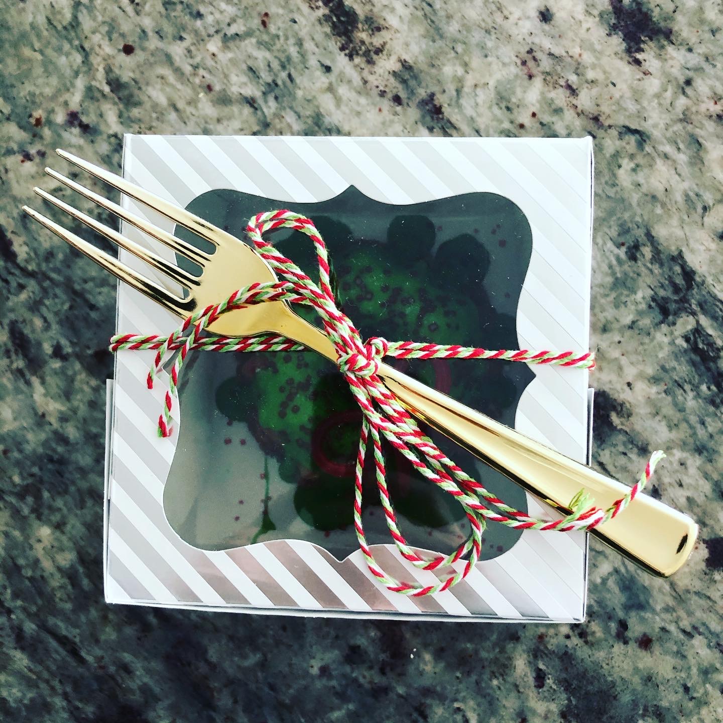 I got the little treat boxes at Walmart and had the gold forks left over from a bridal shower I think, then I just used some red and white Baker’s twine to tie the fork to the treat box.