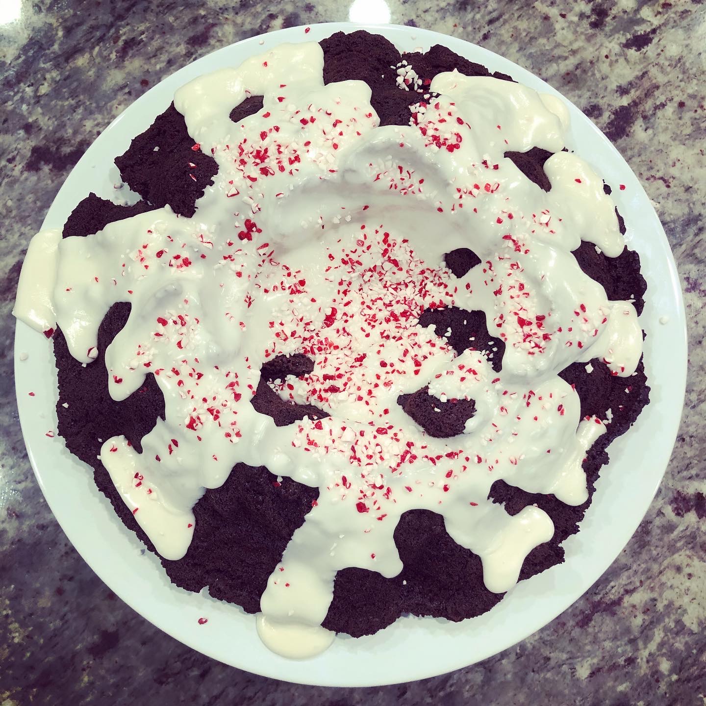 4 For the glaze, whisk together powdered sugar and coffee creamer until you have a nice thick, but still pourable glaze. Drizzle over cake and sprinkled with crushed peppermints.