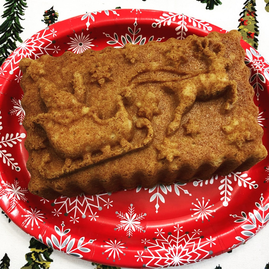 I guess this is it for the holiday baking this year. I had fun, hope you did too following along. We gave this bread away for a gift so I can’t tell you how it tasted but it smelled great! I baked it in my Nordic Ware Loaf Pan and if you look closely you can see Santa and a reindeer pulling his sleigh. I just love Nordic Ware products!