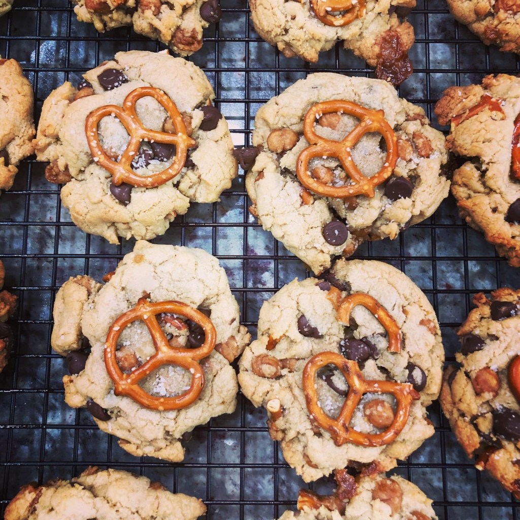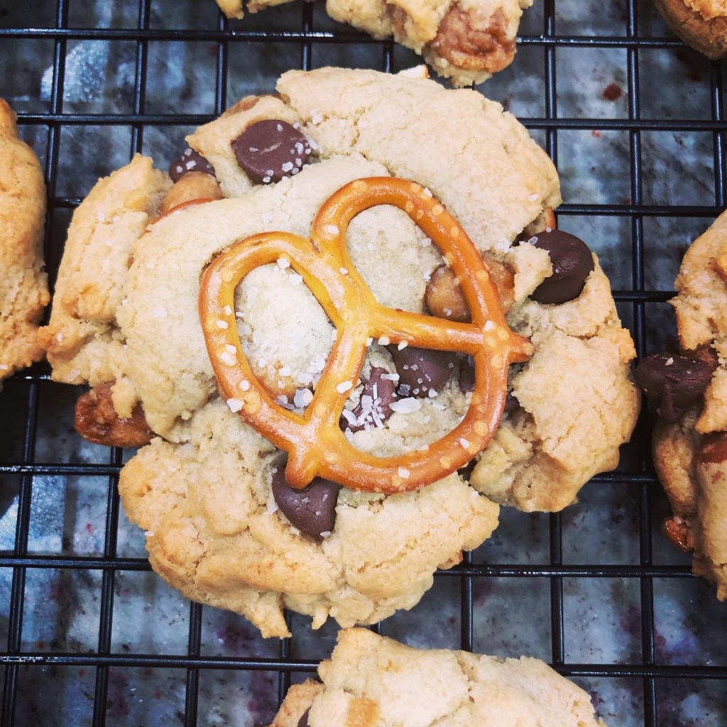 5 Scoop onto to cookie sheets, I used my muffin scoop which is about 1/4 cup. Press the cookies so they are flattened slightly. Top with additional pretzels, caramel bits, chocolate chips, and toffee if desired. Sprinkle with sea salt.