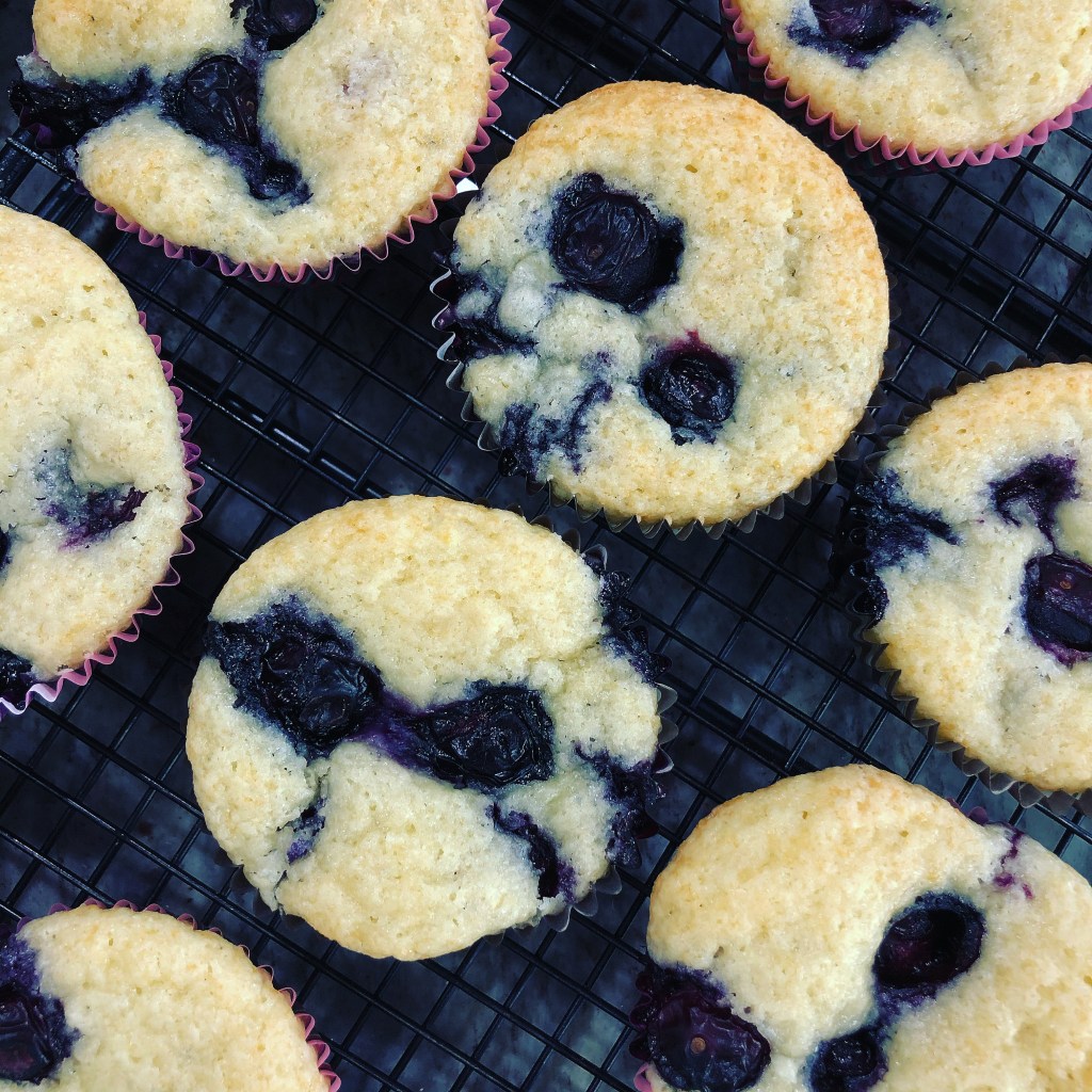 5 Scoop batter into prepared pans. Top with additional blueberries if desired. Bake for about 20 – 25 minutes or until golden brown.