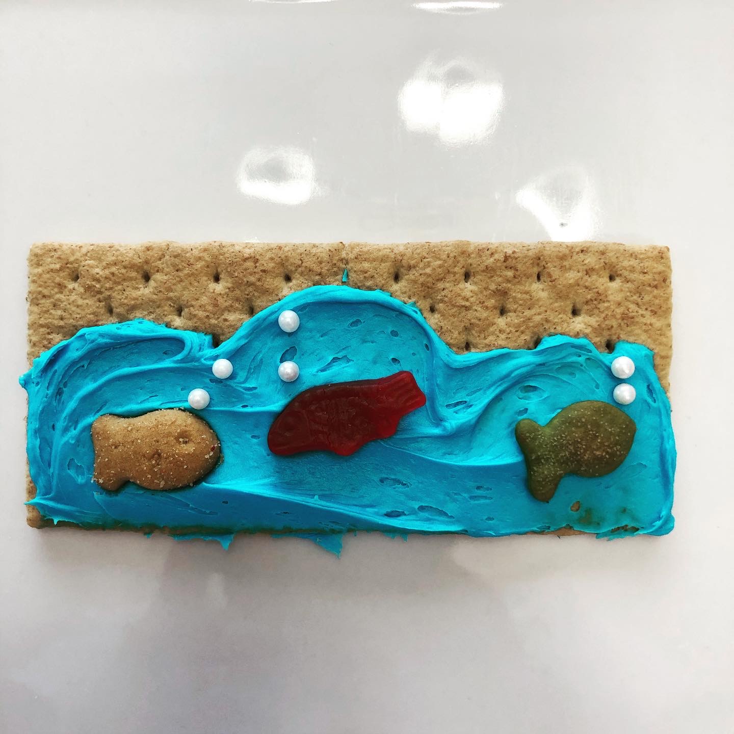 Spread frosting on graham crackers to look like water then decorate as desired. I put one of each kind of “fish” on each cracker then added the embellishments.