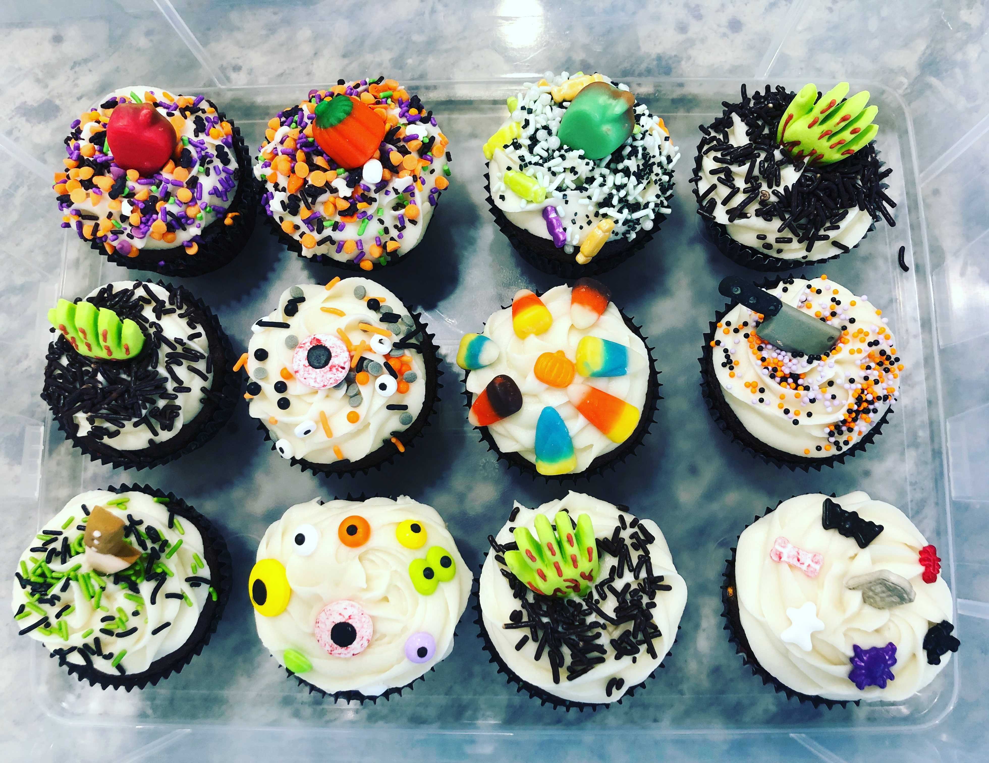various Halloween themed sprinkles, candies, candy eyes, etc