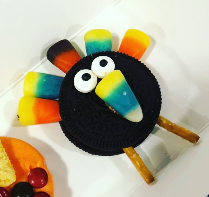 1 Break a pretzel stick in half and carefully push it into the bottom of an Oreo for the legs. Then carefully push 5 candy corns into the top of your Oreo for the feathers.