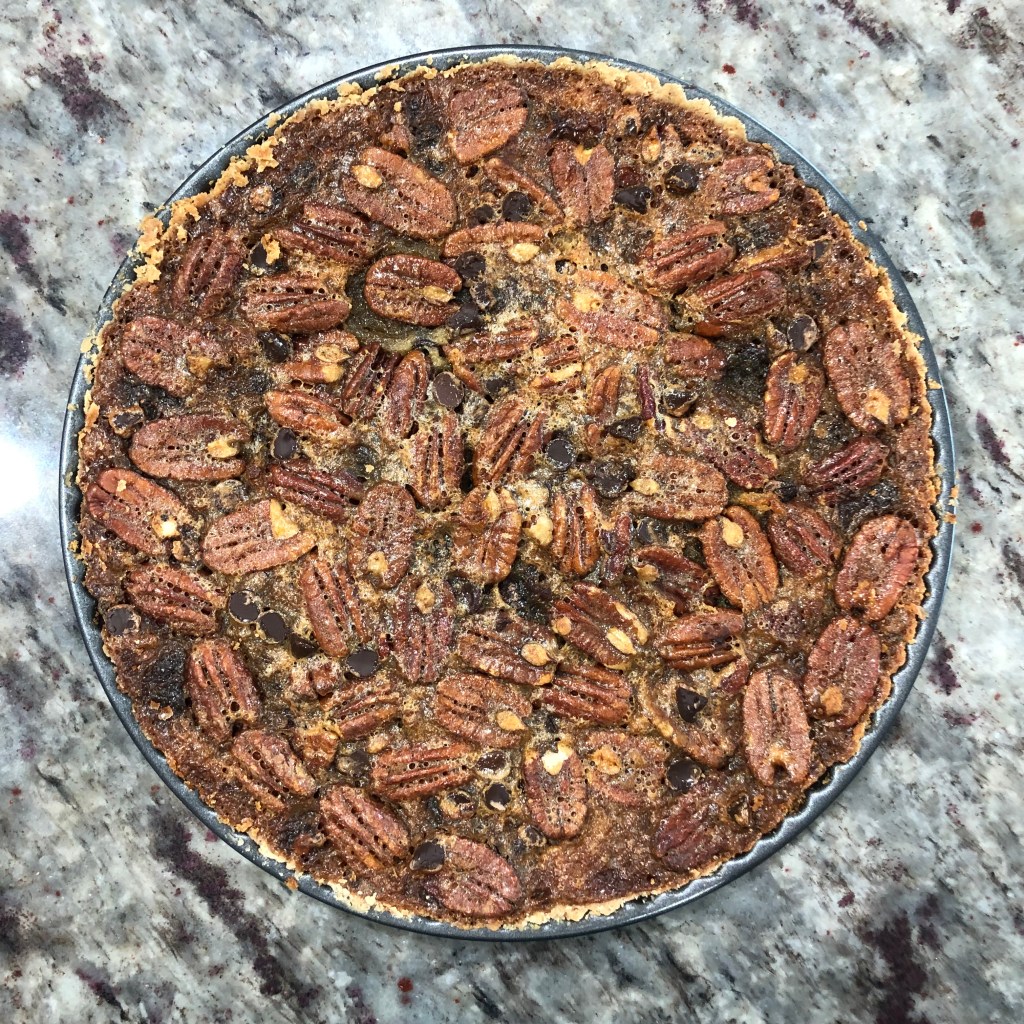 5 In a medium bowl, whisk together brown sugar, remaining 3 tablespoons of flour, and remaining 1 1/4 teaspoons salt until well combined. Beat in corn syrup, honey, eggs, egg white, vanilla, and melted butter. Scatter pecan halves and 1/4 cup chocolate chips over prepared crust then pour sugar mixture over pecans and chips. Sprinkle with remaining 1 tablespoon chocolate chips.