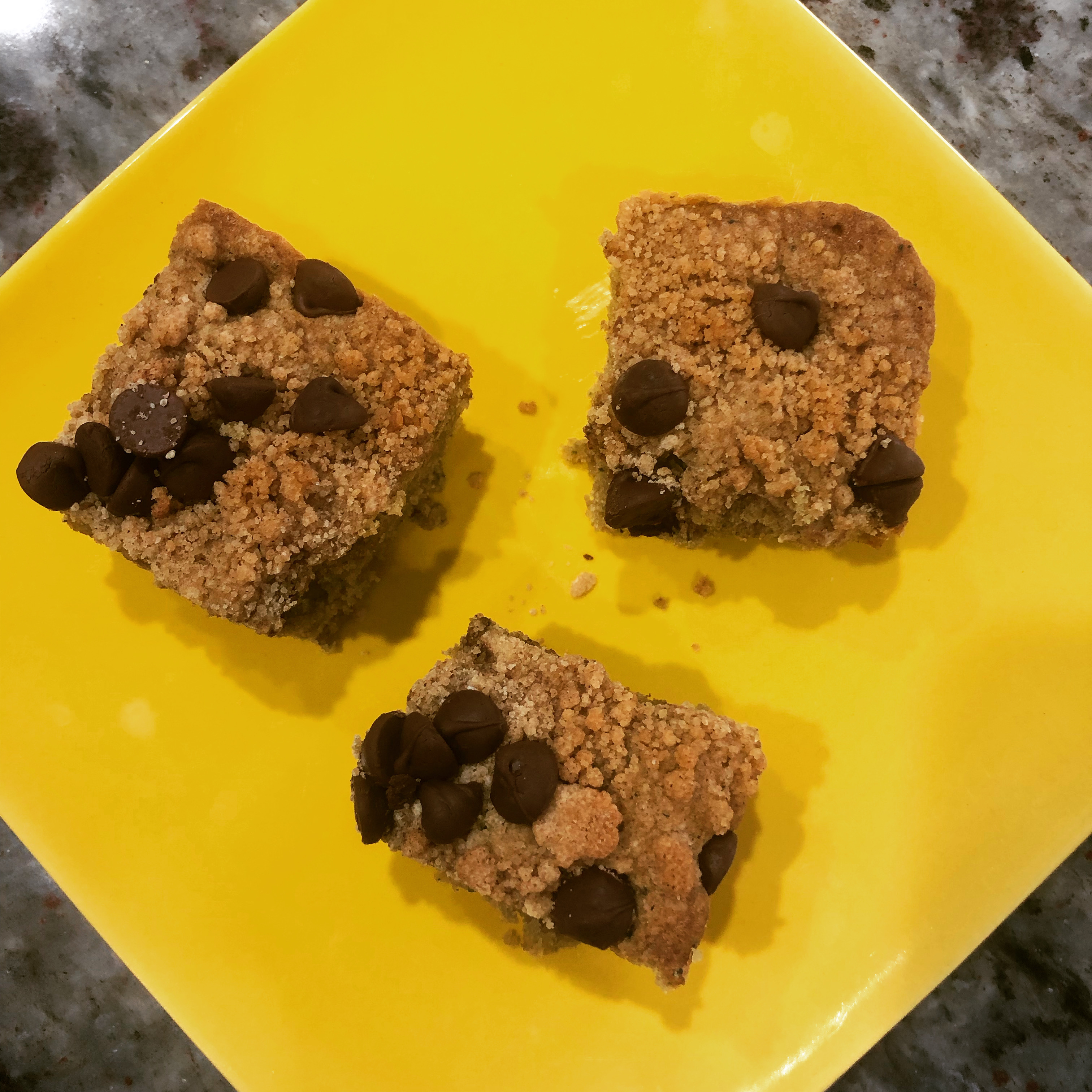 3 Beat in remaining flour, egg, vanilla, and buttermilk then stir in zucchini. Spread into greased 9″ round or square pan. Stir cinnamon into reserved topping and sprinkle over batter then top with chocolate chips.