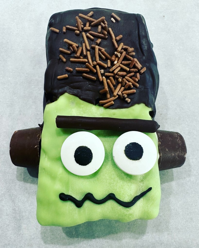 2 Melt green candy melts according to package directions then carefully dip other half of Rice Krispie treats into melted chocolate. Set on parchment and press 2 Rolos on either side of the green portion for his neck bolts, 2 candy eye balls, and a broken piece of Pocky for his unibrow.