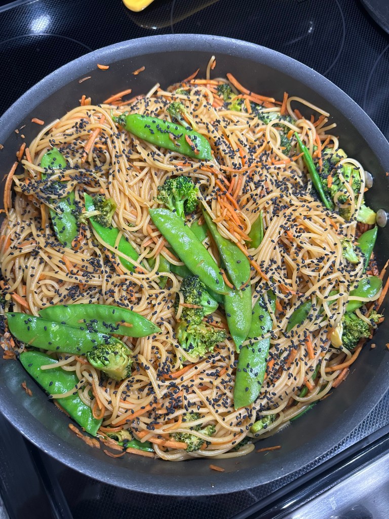 3 Add broccoli, snow peas, and carrots and cook for a few minutes then add cooked and drained noodles to sauce in pan and toss with tongs to coat noodles with sauce. Add remaining tablespoon of sesame oil.