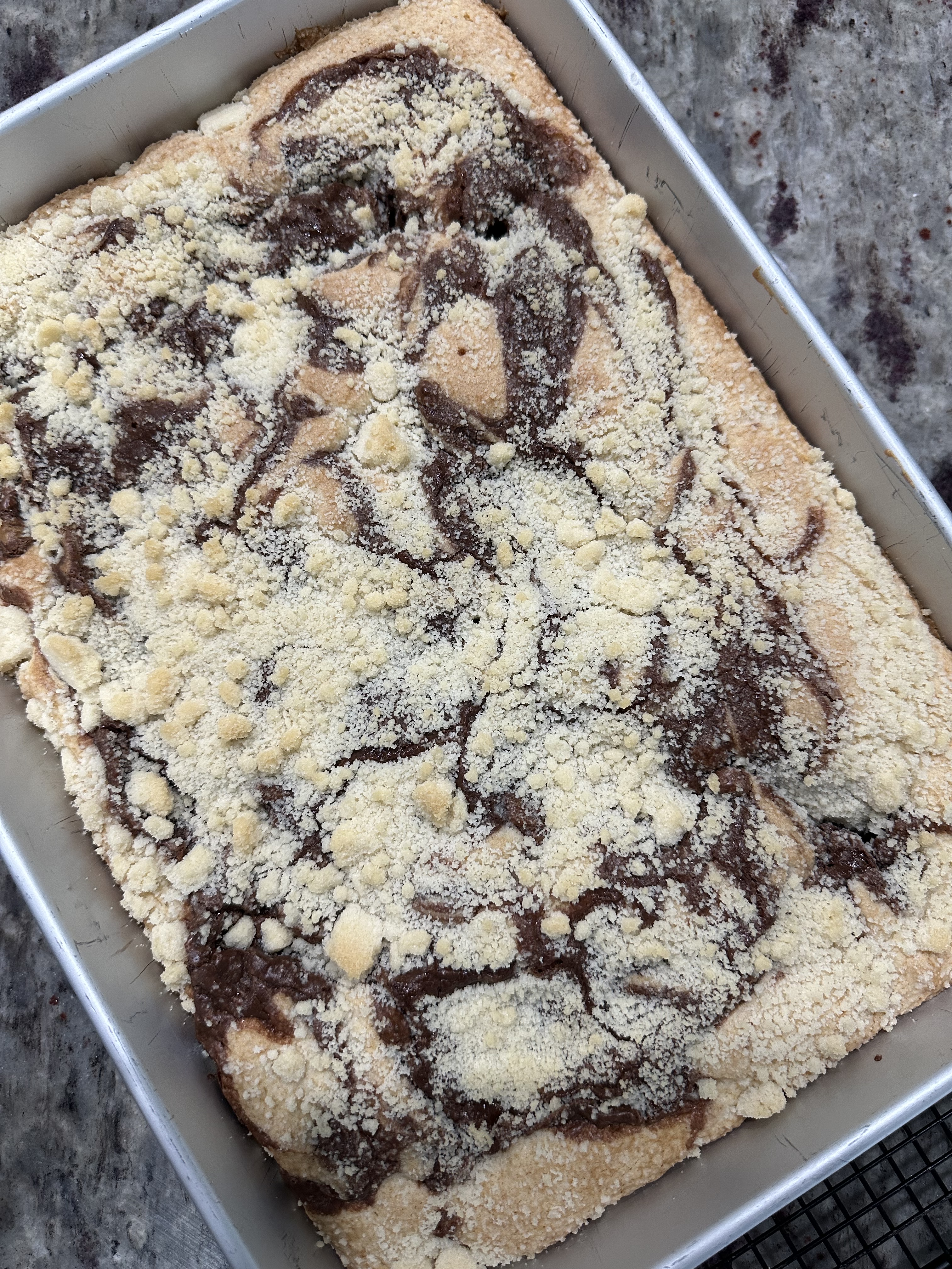 6 Dollop Nutella mixture over the top of the batter and swirl with a knife. Sprinkle reserved crumb mixture over the top. Tap on counter gently a couple of times to release any air bubbles.