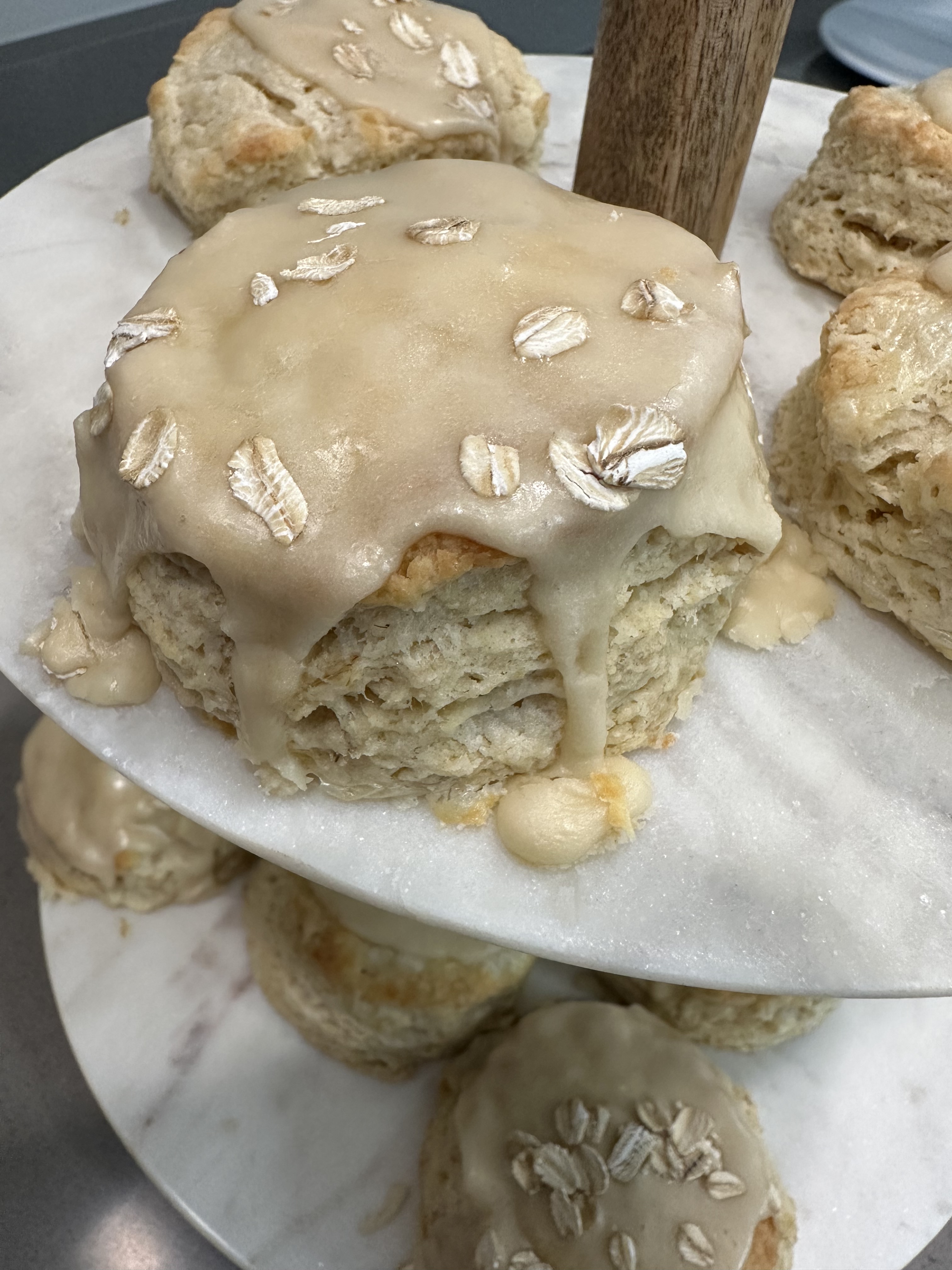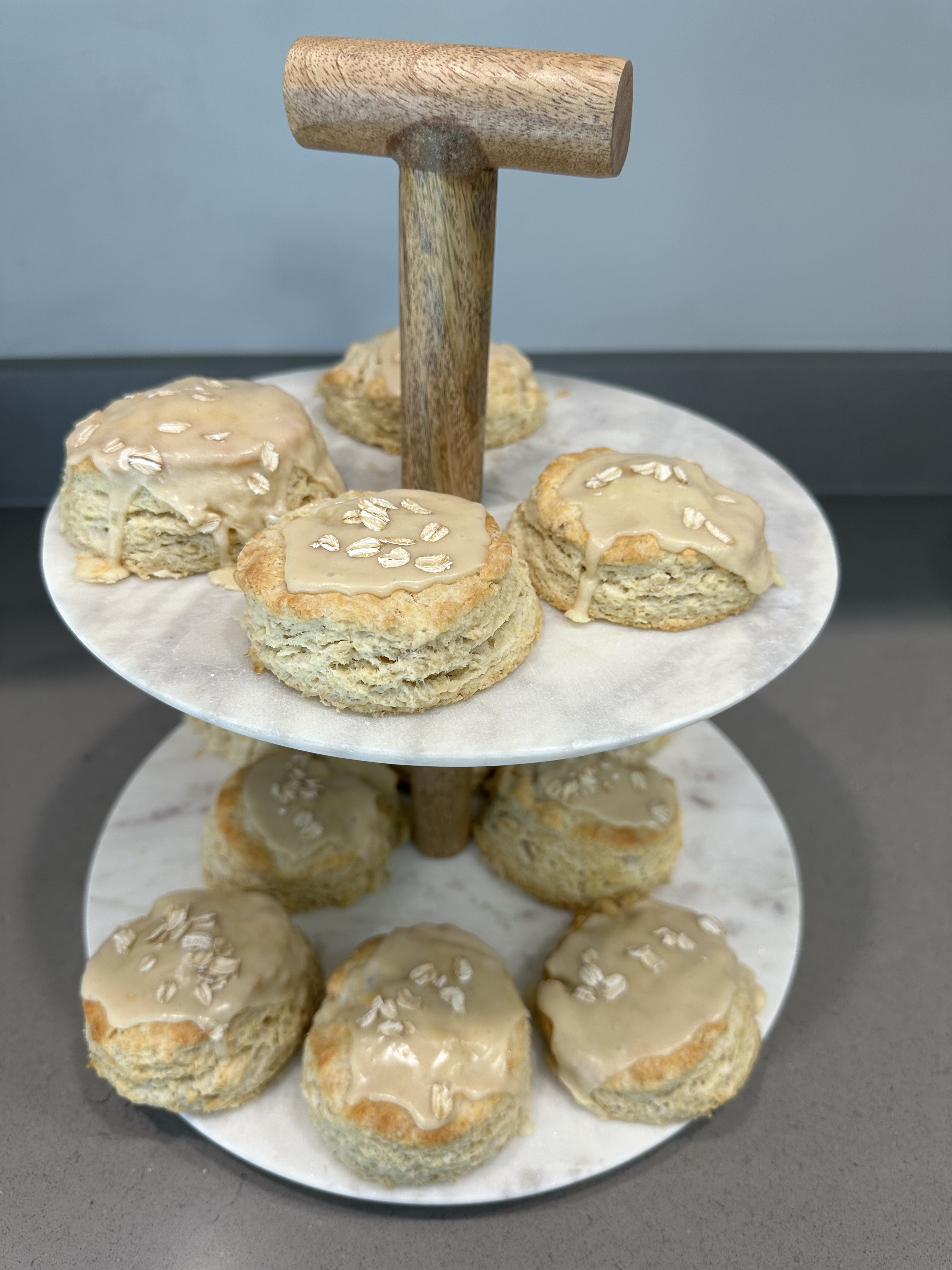 8 For the icing, while scones bake, in a small bowl, whisk together maple syrup, butter, vanilla, and salt. Add powdered sugar and whisk until smooth. Using the back of a spoon, top each scone with icing and a sprinkle of oats.