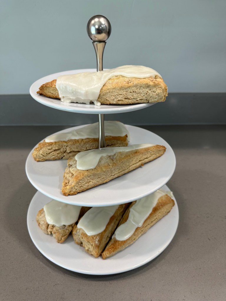 7 Put oven rack in middle of oven and preheat to 375 then stack the sheet pan with the scones on another sheet pan. Brush tops only of triangles with heavy cream. Bake until tops and bottoms are light golden brown, about 18 – 25 minutes.