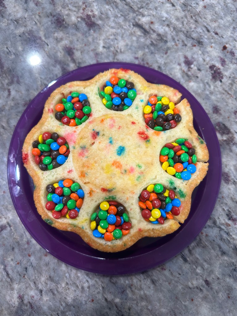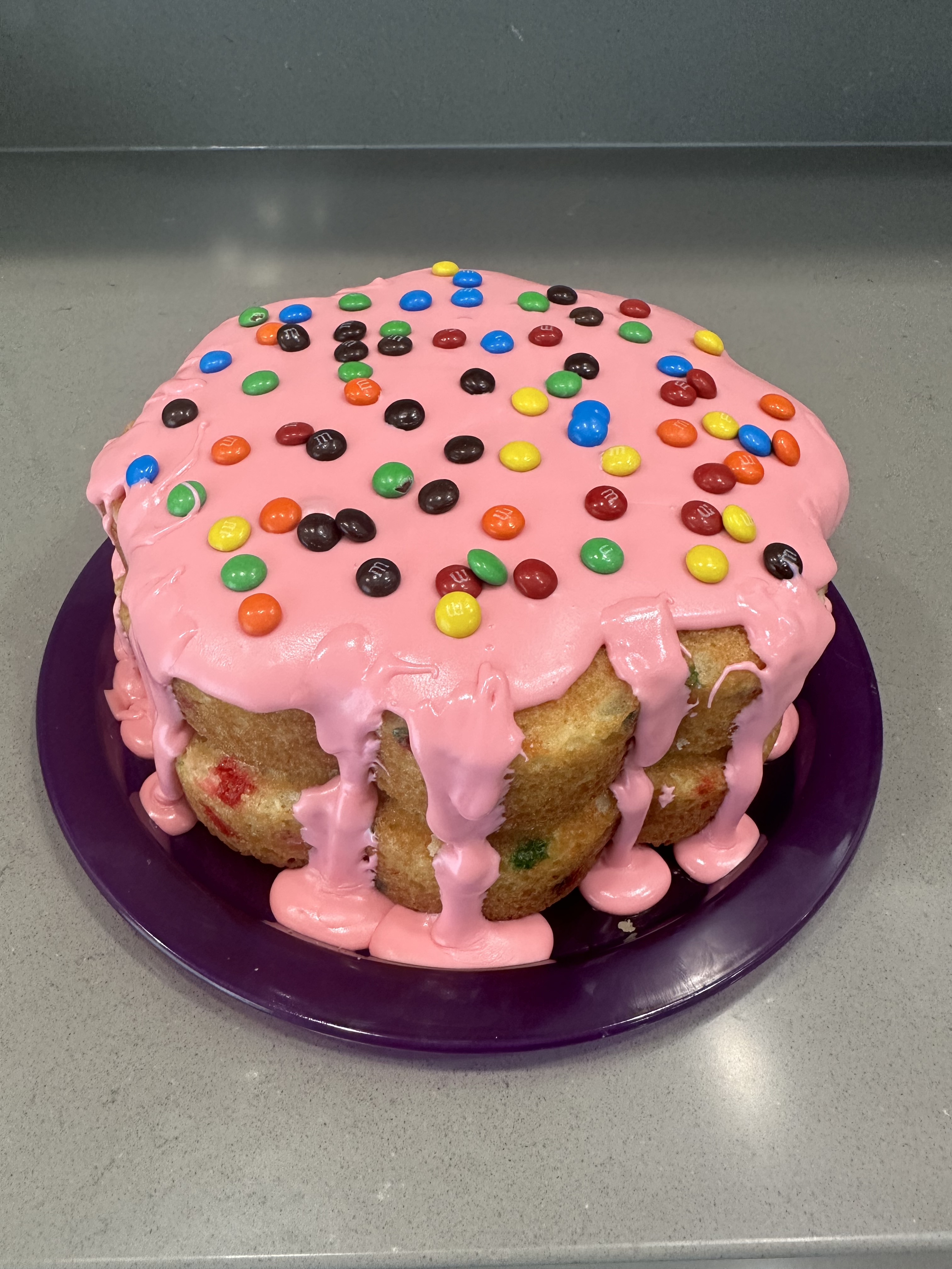 For the cake above, I used a Funfetti cake mix baked in the pans, filled each well with mini M&Ms then did a pink candy melt ganache to drizzle over the top and down the sides and finished with a scattering of mini M&M’s on top.