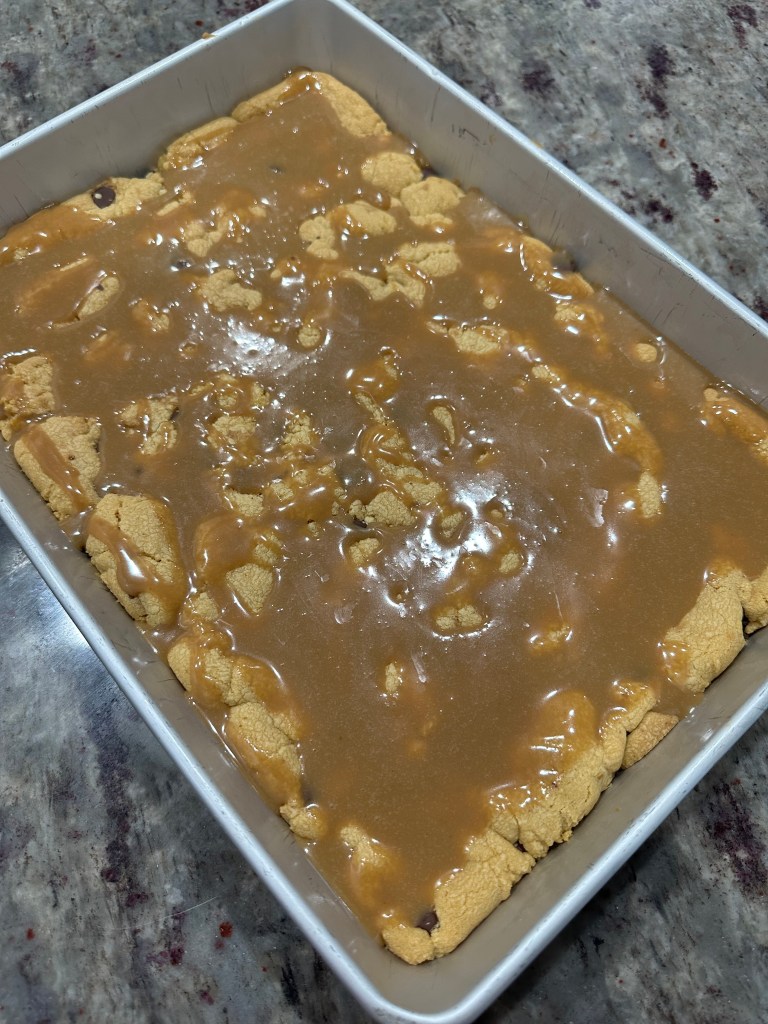 2 Mix together butter, cake mix, egg, and Biscoff in a large bowl then stir in chocolate chips. Press dough into prepared pan and bake 15 – 20 minutes or until baked through. Let cool 20 minutes.