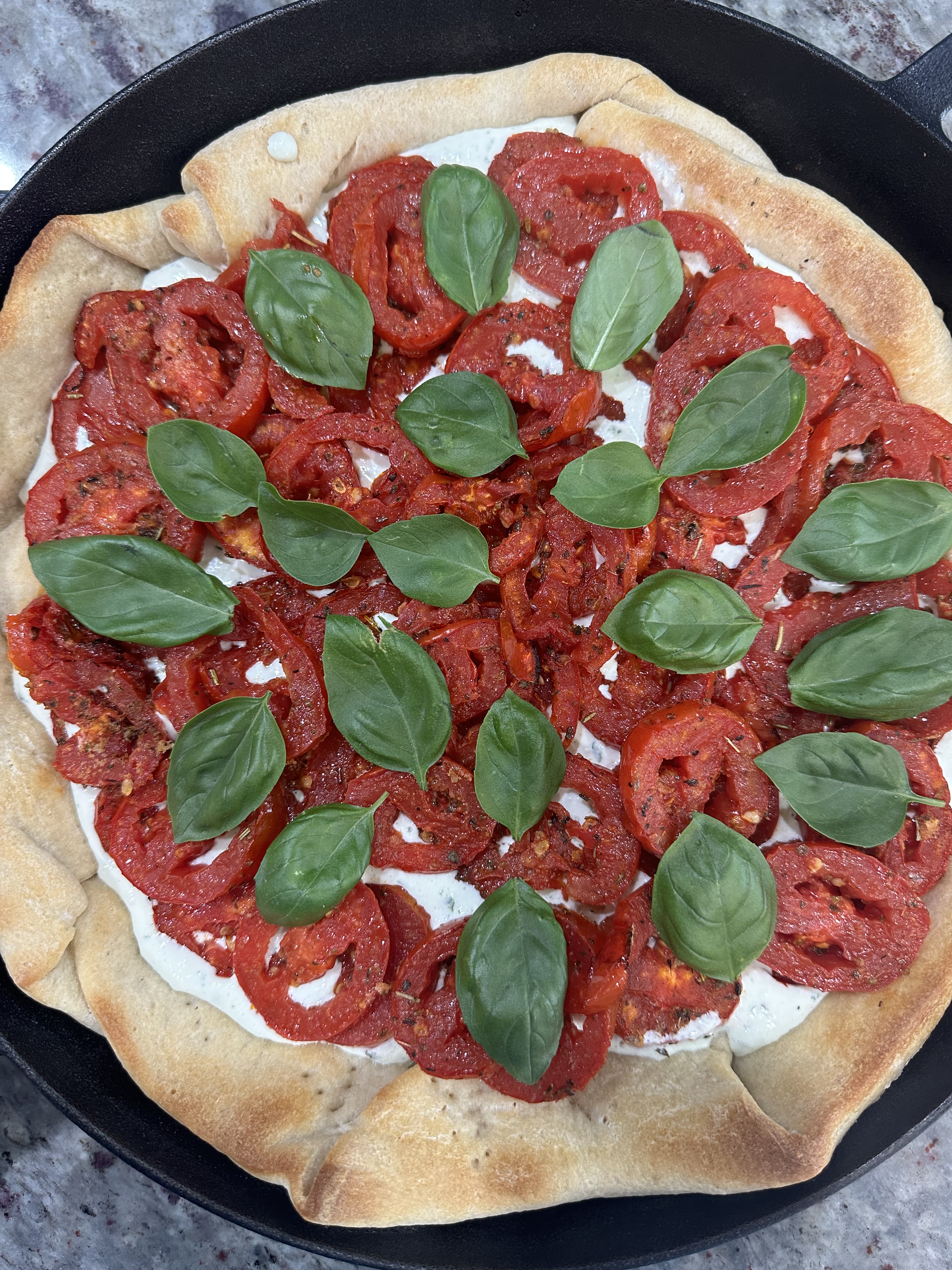 4 Place skillet with crust on bottom rack and pan with tomatoes on top rack and bake until crust has browned and tomatoes of softened, about 17 – 20 minutes.