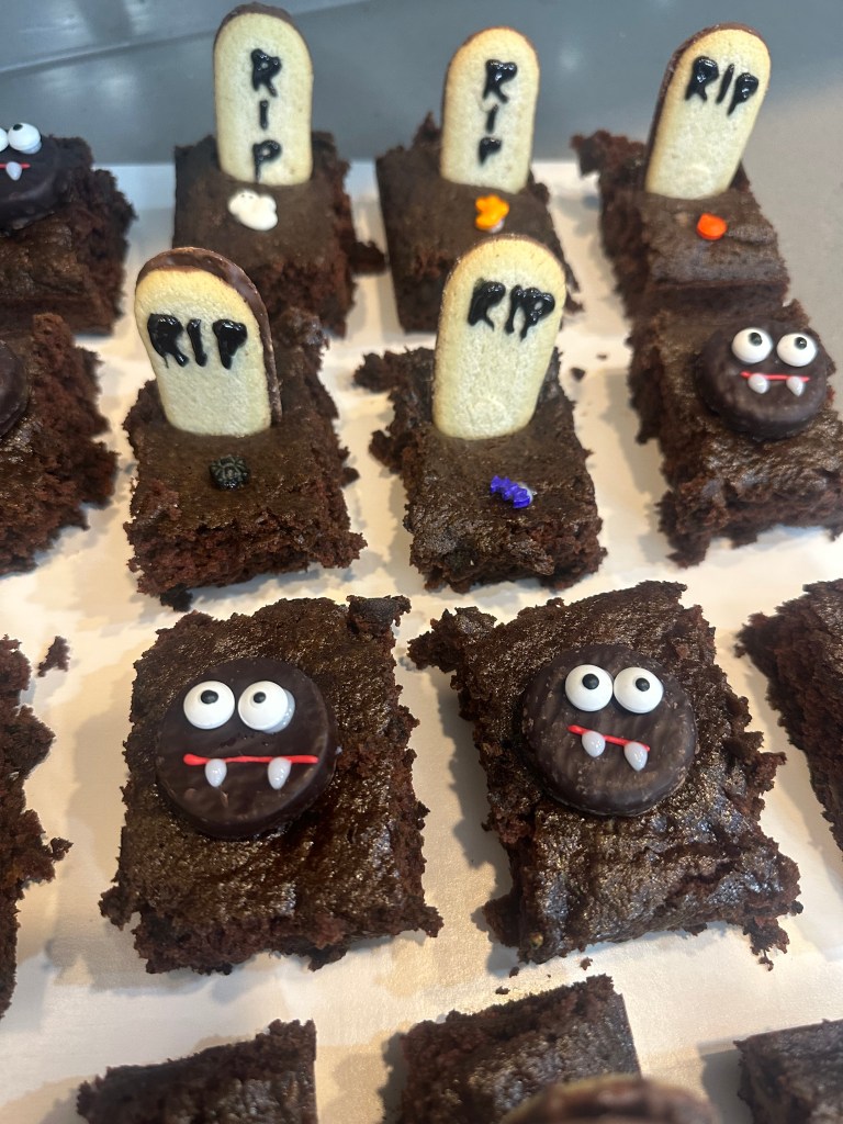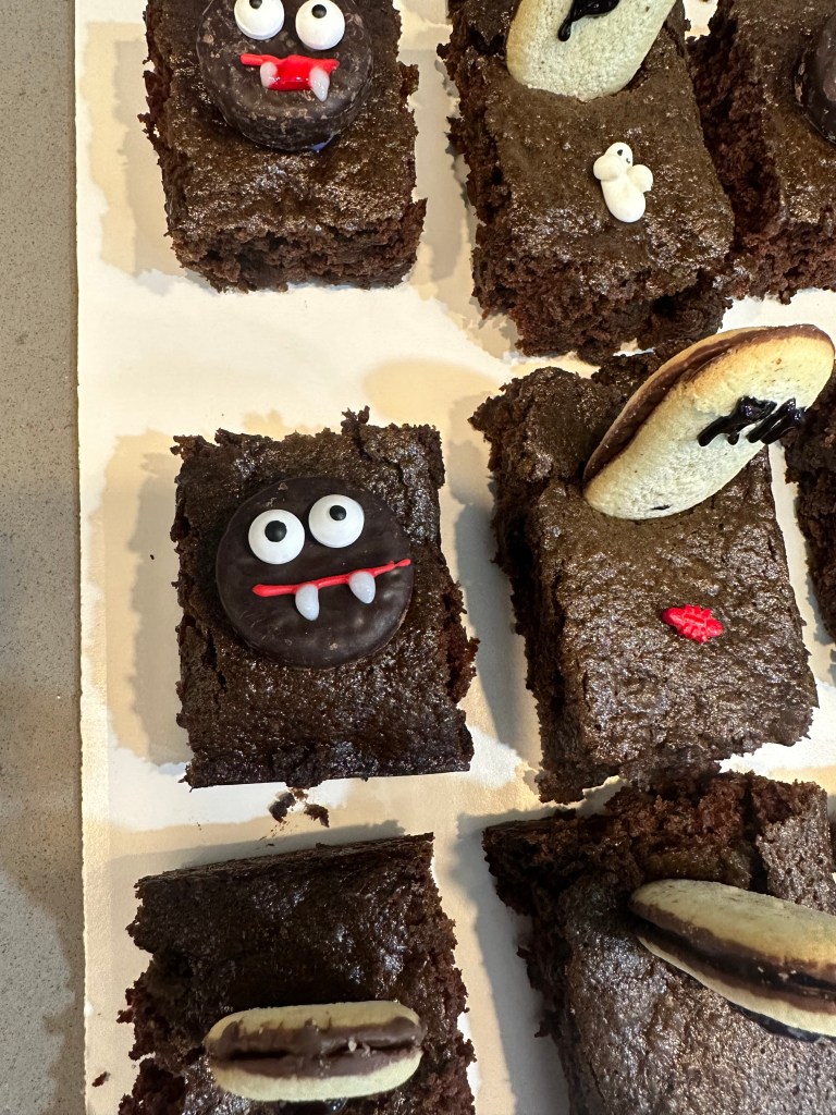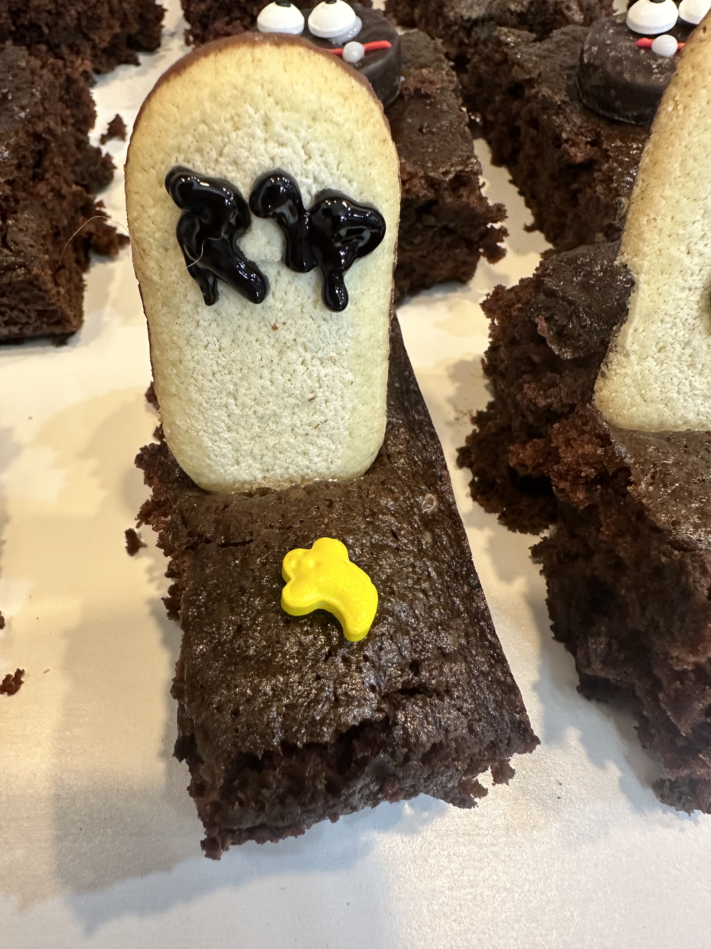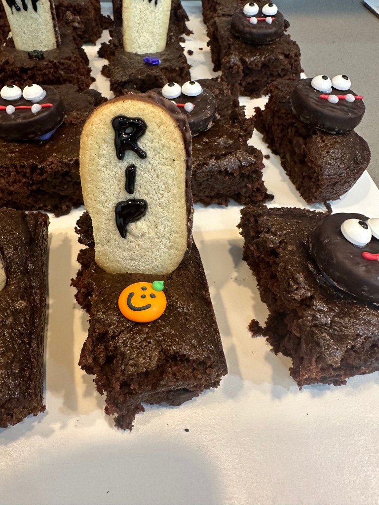 I started off by making two pans of my favorite zucchini brownies, recipe here, with the last of the zucchini from my garden and a neighbor’s, thanks Torgersens! When the brownies cooled, I cut each pan into 16 brownies, making some of them long and skinny to be headstones and the other more square for the minty bats.
