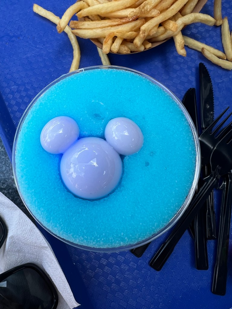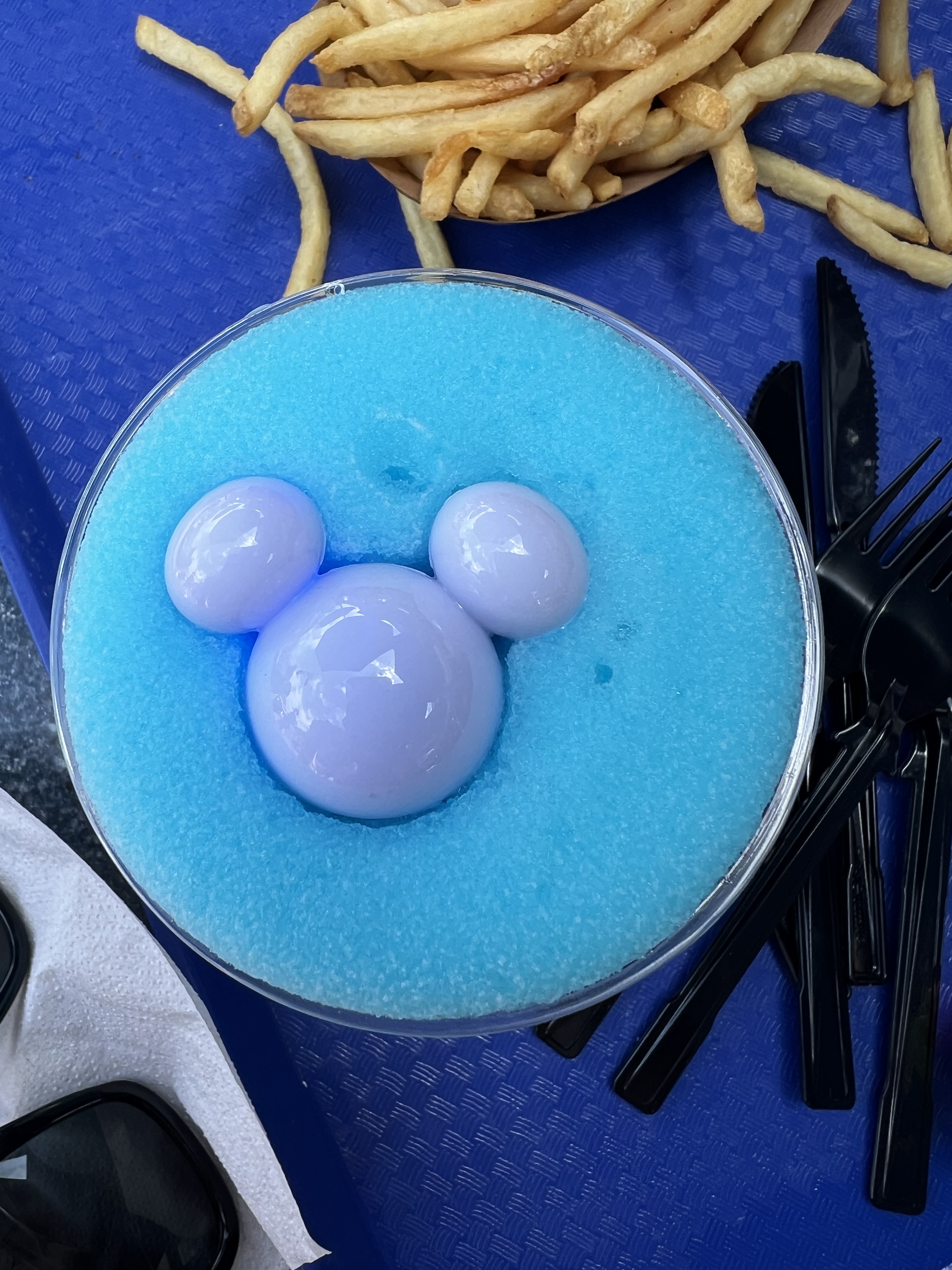Courtney went over to the Galactic Grill and grabbed some fries and a Blue Raspberry Slush with a Mickey shaped Light Up Glow Cube to go with the brat. The slushy was especially good because it was pretty warm that day.