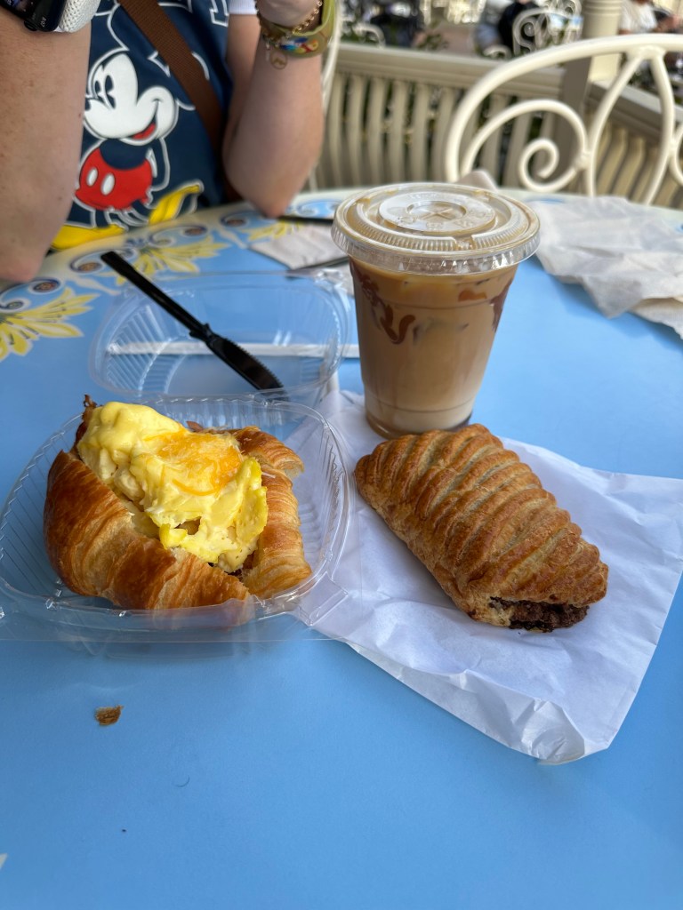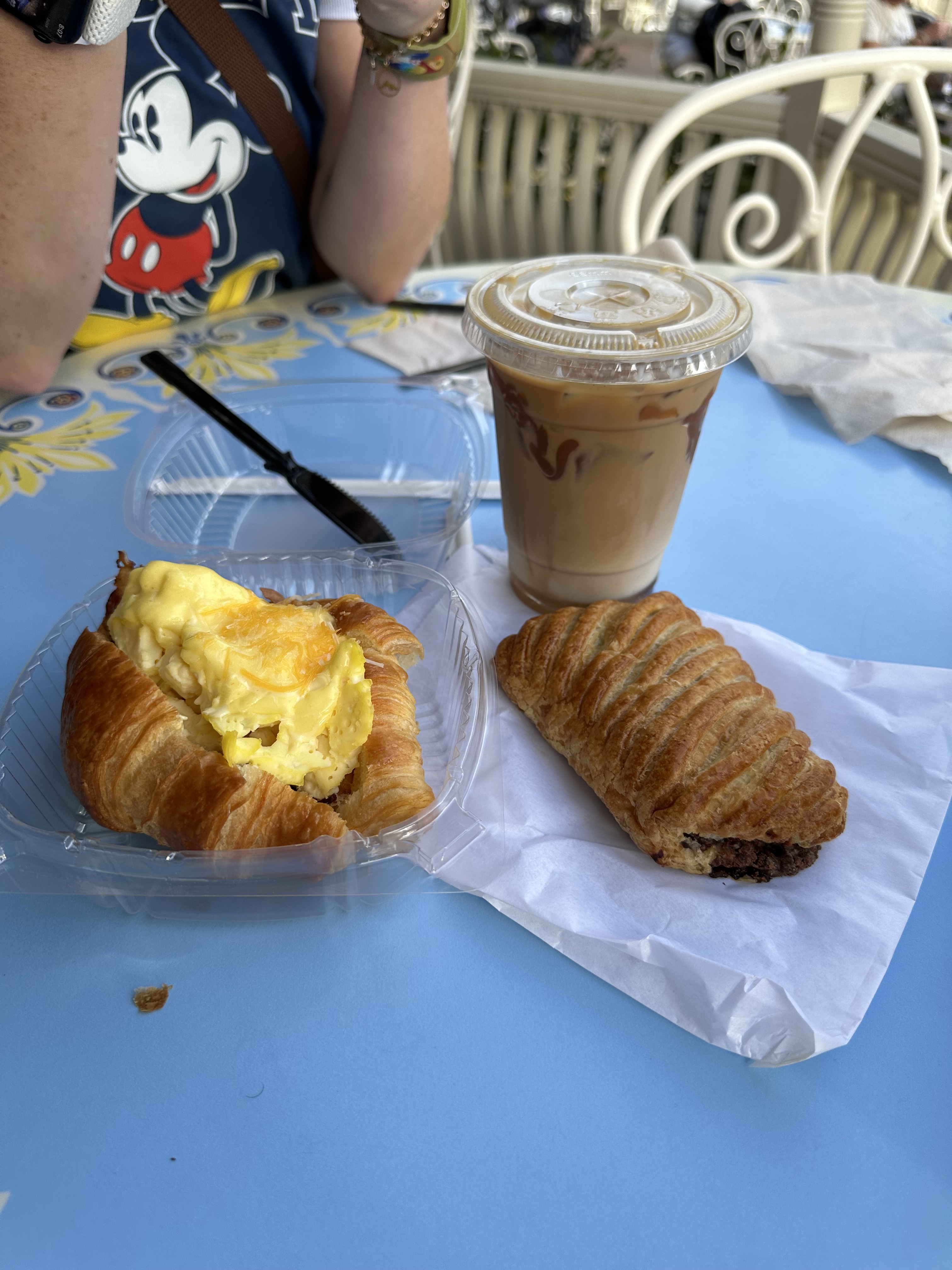Day 2 was our first official day in Disneyland so we started off with breakfast at one of our favorite places to eat, Jolly Holiday Bakery. We got two breakfast croissants, one bacon, egg, and cheese and the other a chocolate croissant. We shared and had a half each. They were delicious. Also an Iced Caramel Macchiato which was super yummy.